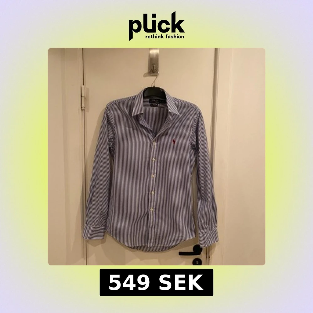 Snygg blå- och vitrandig skjorta från Polo Ralph Lauren med klassisk krage och knappar framtill. Den har långa ärmar och en broderad logotyp i rött på bröstet. Perfekt för sommaren. Nyskick. Passar S perfekt