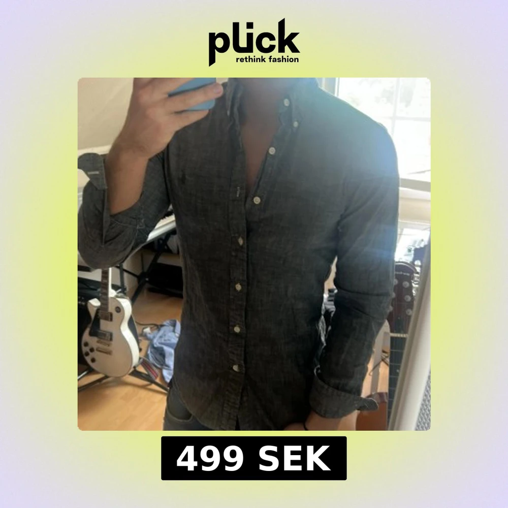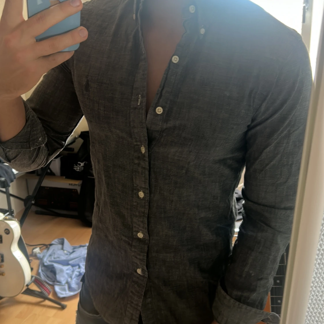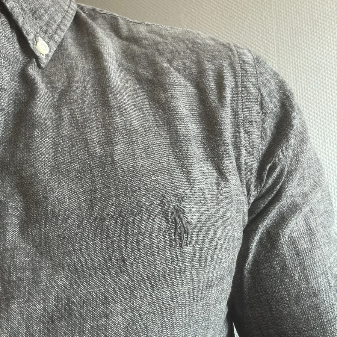 Säljer en mörkgrå skjorta från Ralph Lauren med klassisk broderad logga på bröstet. Skjortan har lång ärm, knappar hela vägen och button-down krage. Perfekt till jeans för en clean look.