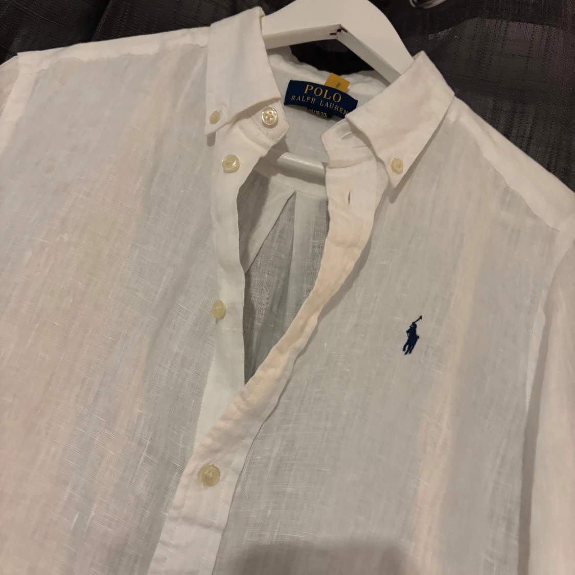 Klassisk vit skjorta i linne från Polo Ralph Lauren med button down-krage och blå broderad logga på bröstet. Långärmad modell med knappar framtill, perfekt för en clean och fräsch stil. Luftigt material som passar när du vill hålla det chill men ändå snyggt.
