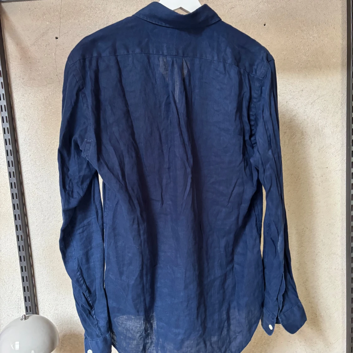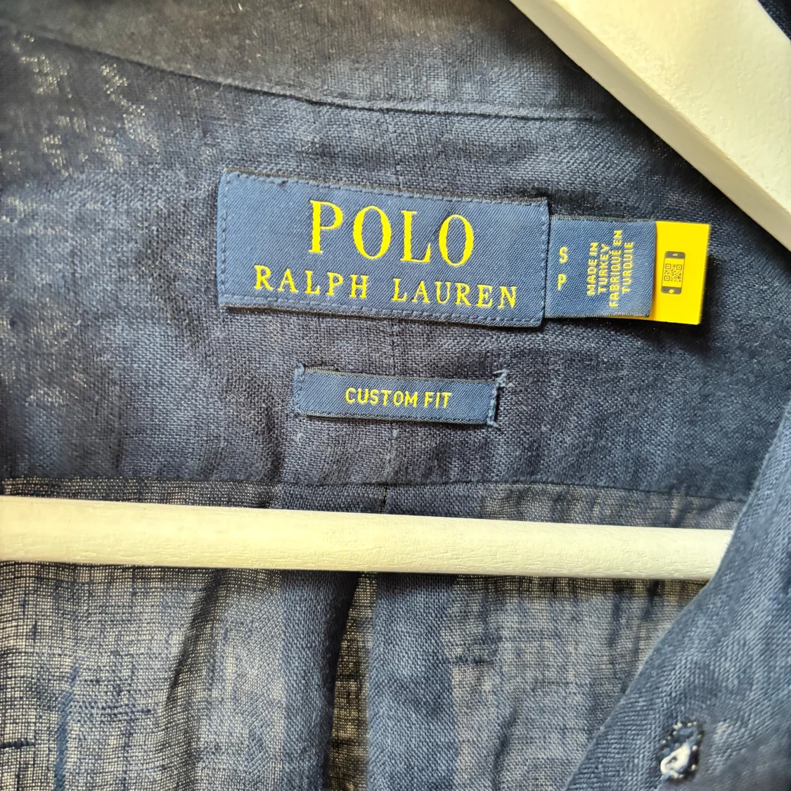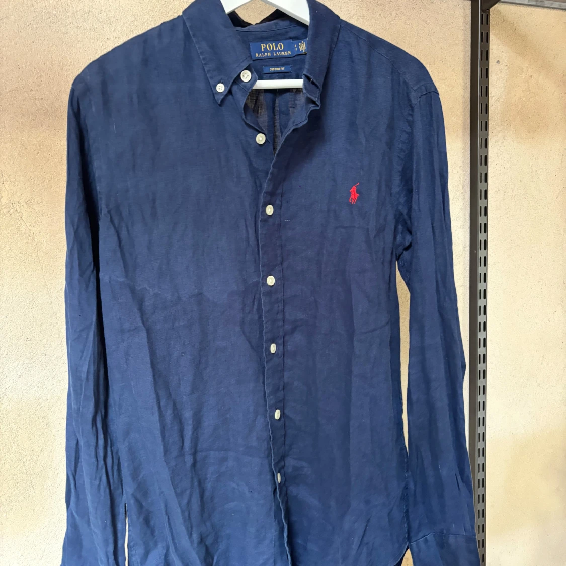 Snygg marinblå skjorta från Polo Ralph Lauren i linne med klassisk krage, vita knappar och röd broderad logga på bröstet. Custom fit-modell med lång ärm, perfekt för en stilren och avslappnad look.