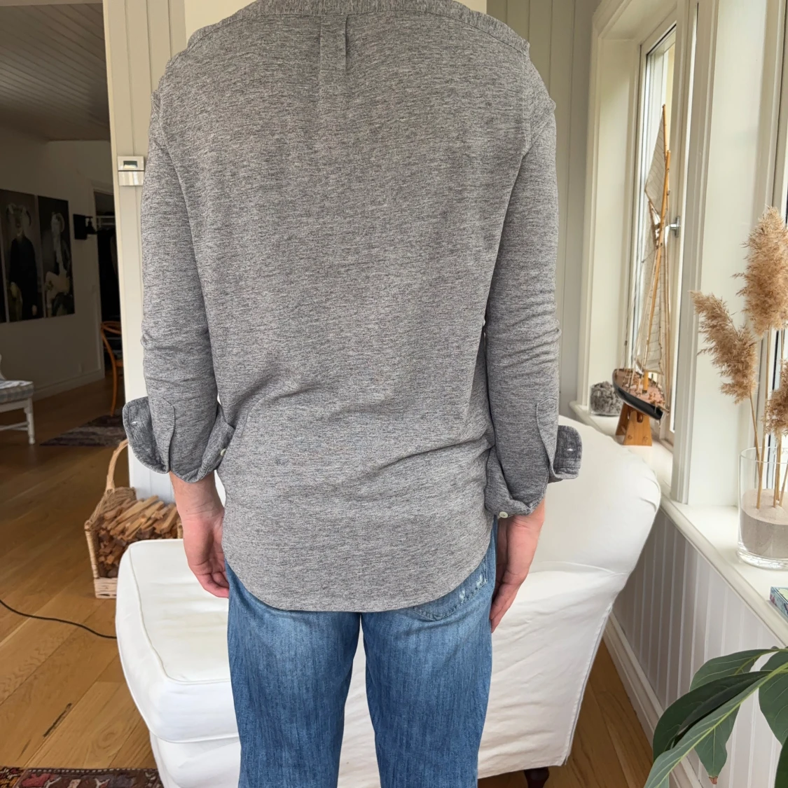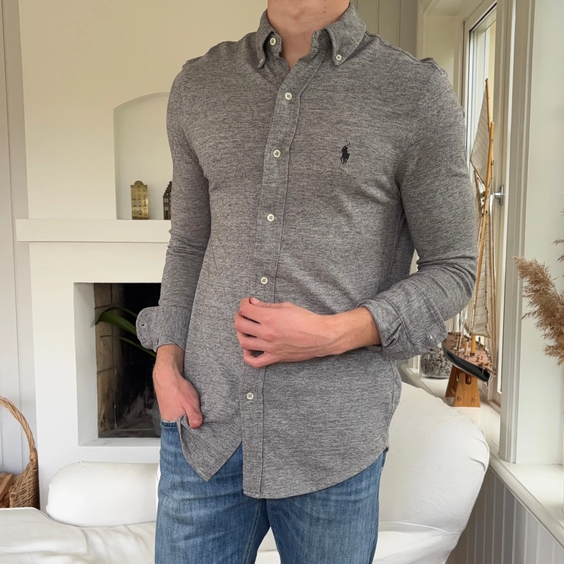Snygg grå skjorta från Ralph Lauren med klassisk button-down krage och broderad logga på bröstet. Skjortan är tillverkad i mjuk bomullsmix och har långa ärmar samt knappar framtill. Perfekt för en stilren och avslappnad look.