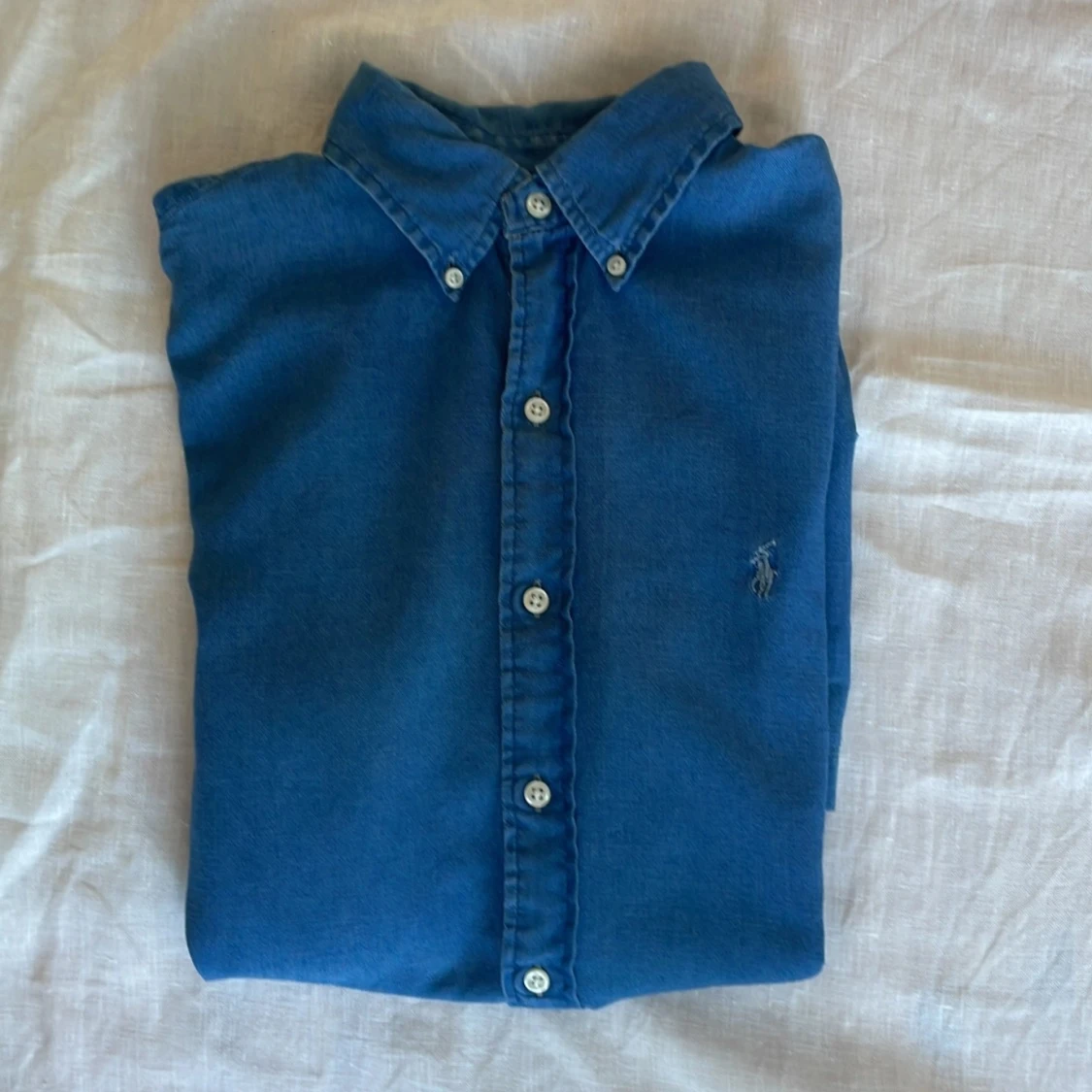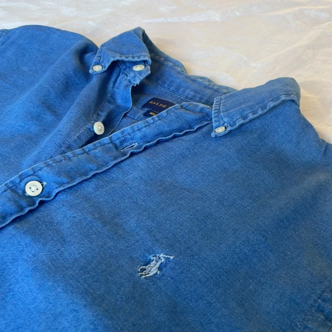 Snygg blå skjorta från Ralph Lauren med korta ärmar och klassisk button-down krage. Skjortan har vita knappar framtill och den ikoniska broderade loggan på bröstet. Tillverkad i mjuk bomull, perfekt för en chill och stilren look.