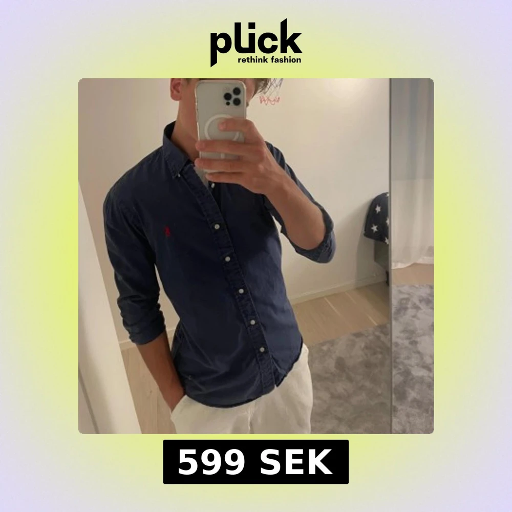 Säljer en mörkblå skjorta från Ralph Lauren i slim fit-modell. Skjortan är tillverkad i bomullspoplin och har klassisk krage, knäppning framtill och det ikoniska röda Polo-logot broderat på bröstet. Perfekt för en clean och stilren look.