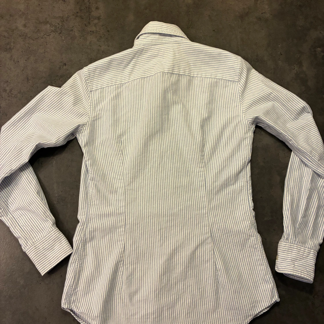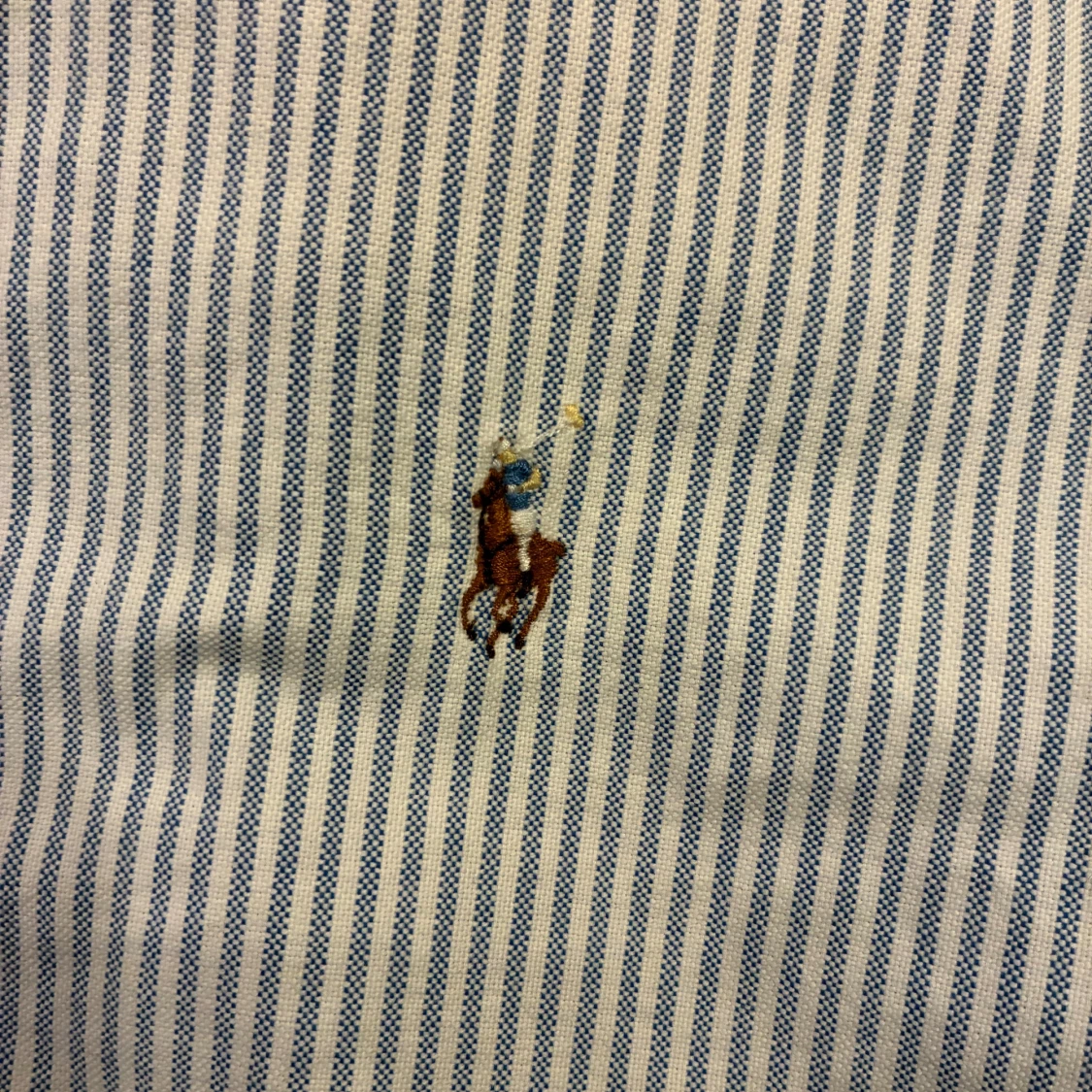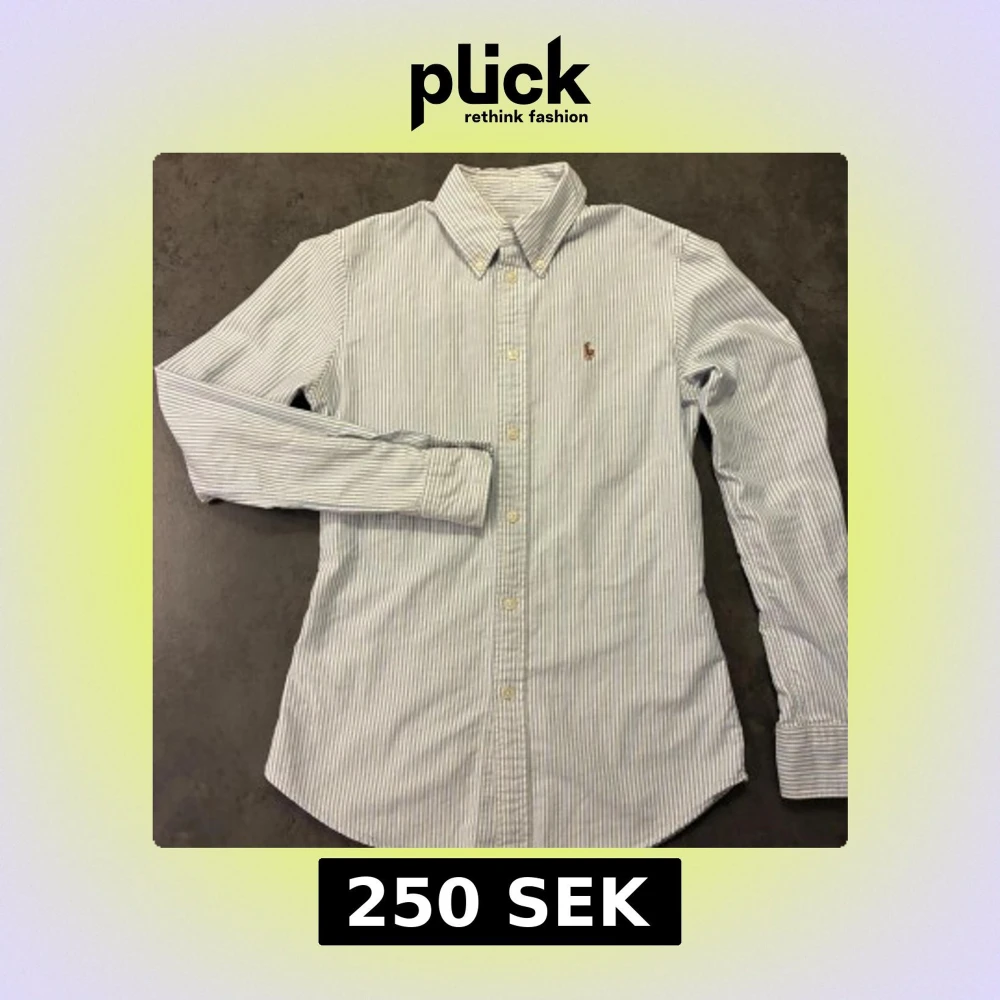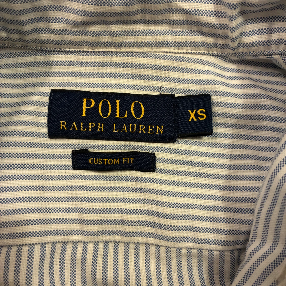 Klassisk feminin skjorta från Polo Ralph Lauren i vitt och blått med smala ränder. Custom fit-modell med lång ärm, knappar framtill och broderad logga på bröstet.