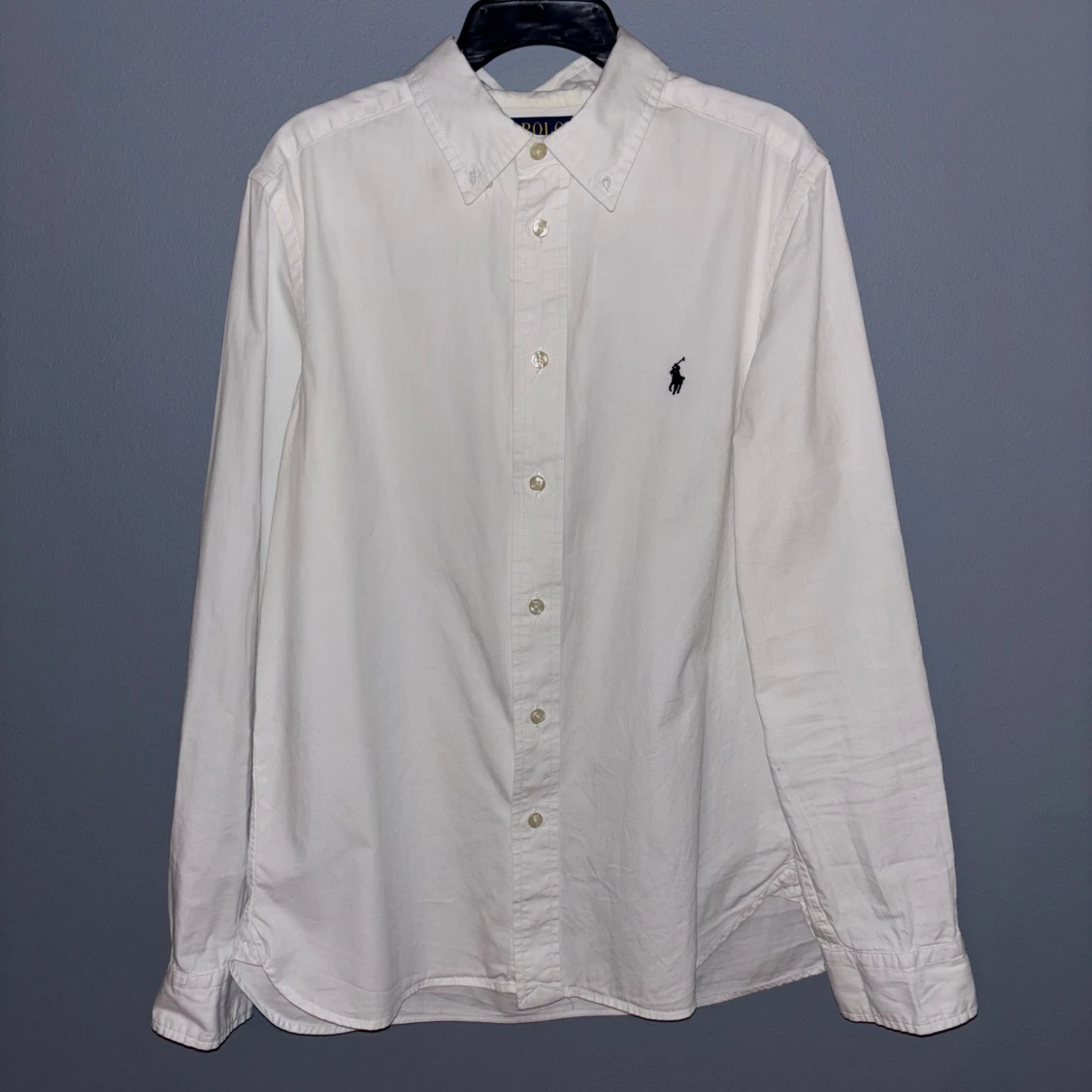 Vit skjorta från Polo Ralph Lauren mad svart logotyp på bröstet. Skulle passa bra mellan längderna 168-173 cm.