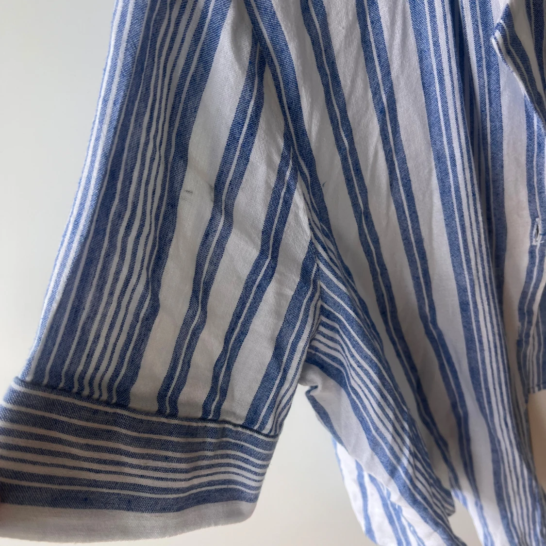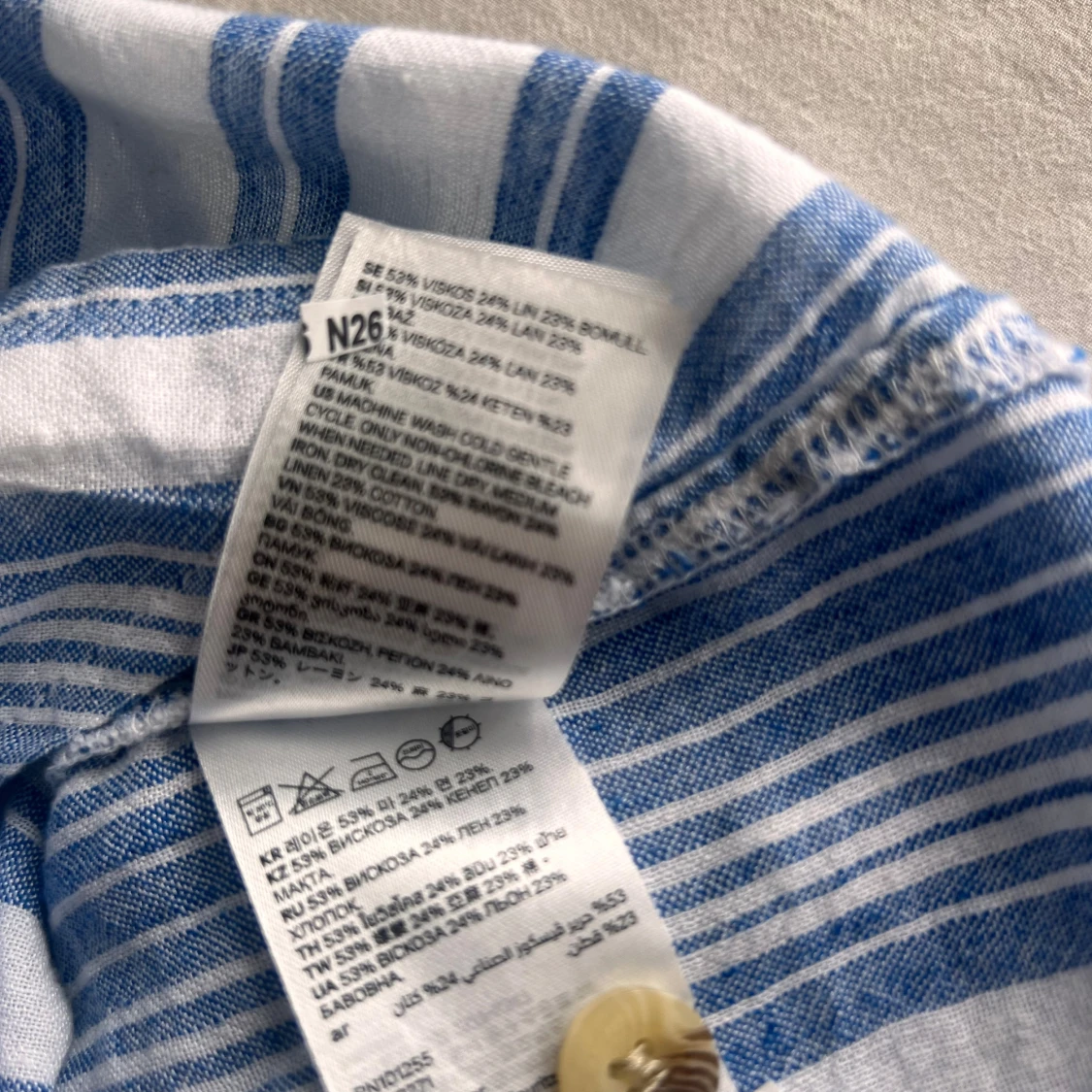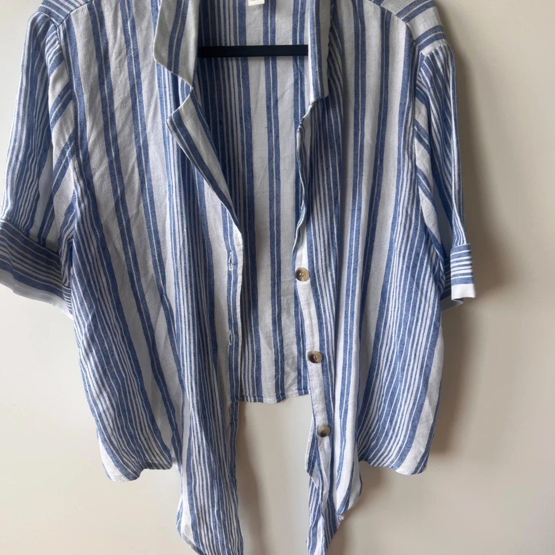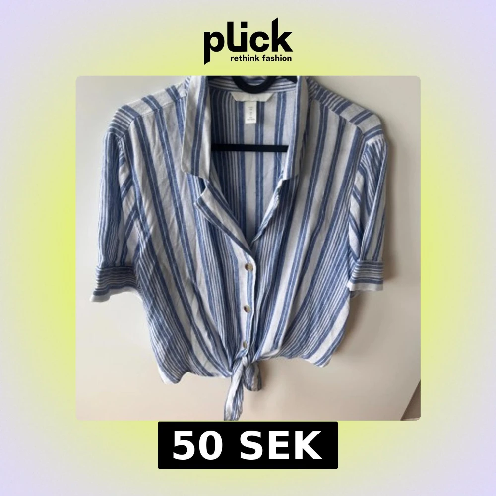 Säljer en blåvit randig skjorta från H&M i storlek 44. Skjortan har korta ärmar, knappar framtill och en snygg knytning nedtill. Tillverkad i ett lätt och luftigt material, perfekt för varmare dagar. Klassisk krage och relaxed fit.