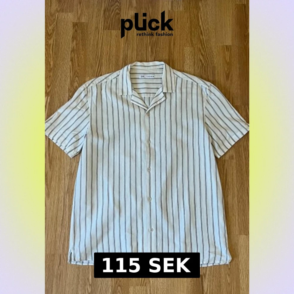 Snygg kortärmad skjorta från Zara i storlek L. Skjortan är vit med tunna svarta vertikala ränder, har klassisk krage och knäppning framtill. Tillverkad i ett luftigt linnematerial som passar perfekt när det är varmt ute. Enkel och stilren design som är lätt att matcha.