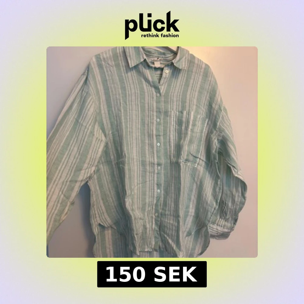 Snygg oversized skjorta från Lemlem x H&M i ljusgrönt och vitt med randigt mönster. Skjortan är i luftigt linne, har långa ärmar, bröstficka och knappar framtill. Perfekt för en chill och stilren look.