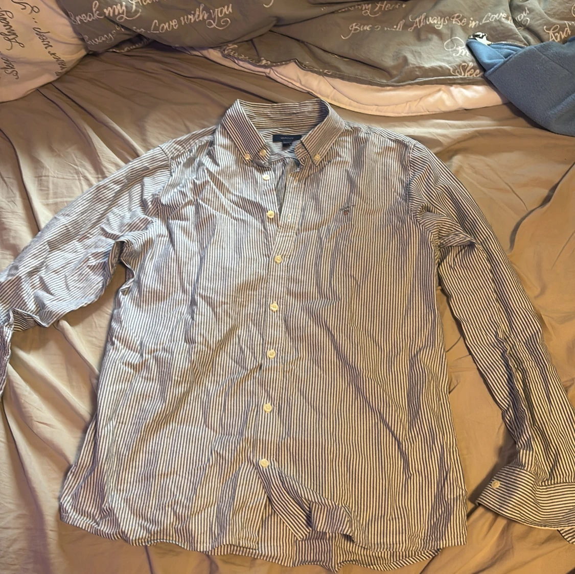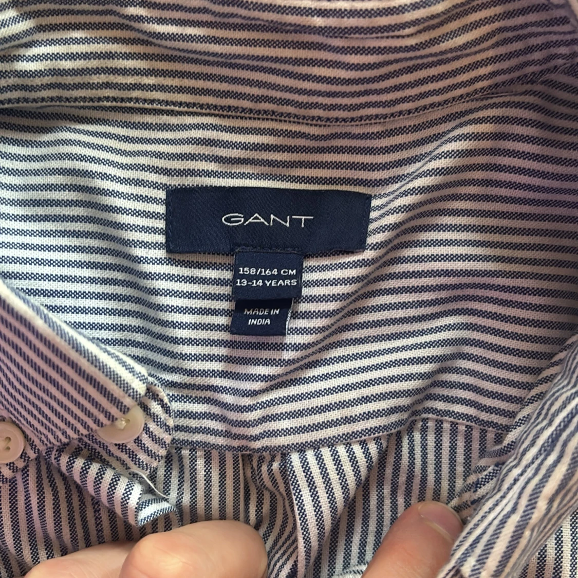 Snygg skjorta från Gant i vitt och blått med smala ränder. Klassisk krage, knäppning framtill och långa ärmar med manschett. Tillverkad i mjuk bomull, perfekt för en stilren look. Passar dig som gillar tidlös och clean stil. Passar ca 170