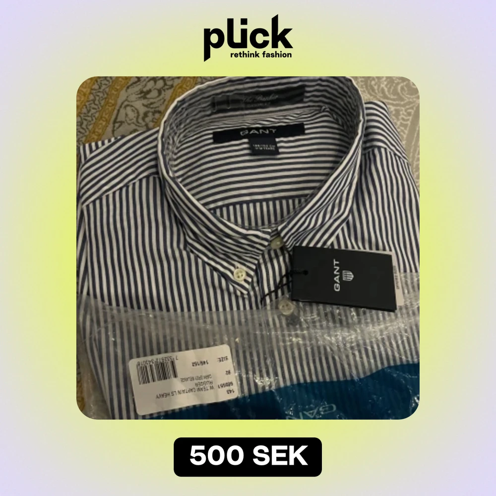 Säljer en snygg och klassisk randig skjorta från GANT. Skjortan är vit och blå med knappar framtill. Perfekt för både vardag och festliga tillfällen. Passar för åldrarna 11-12 år.