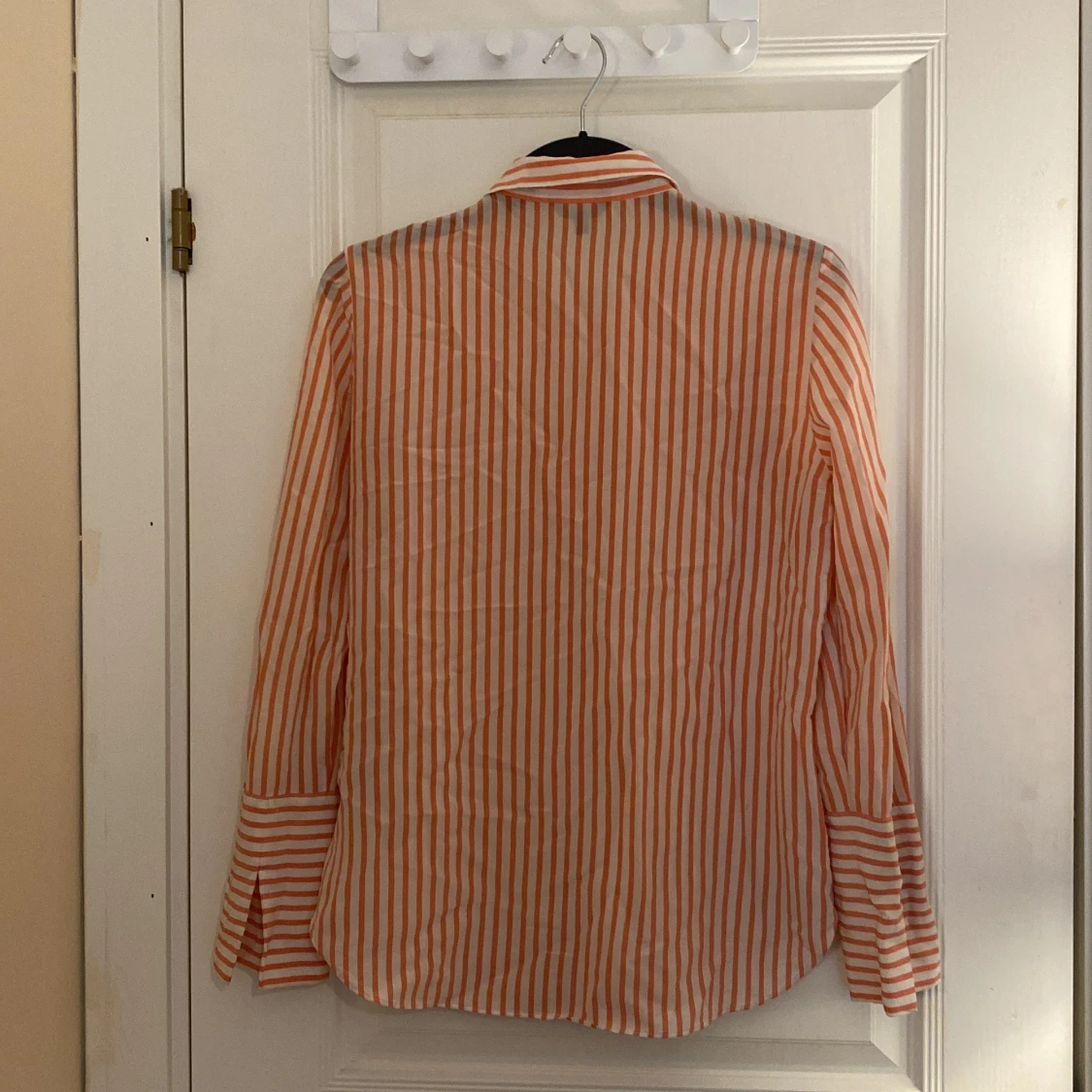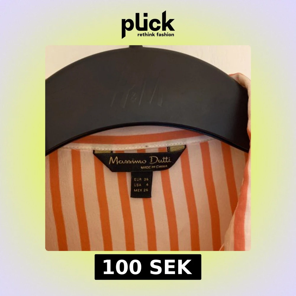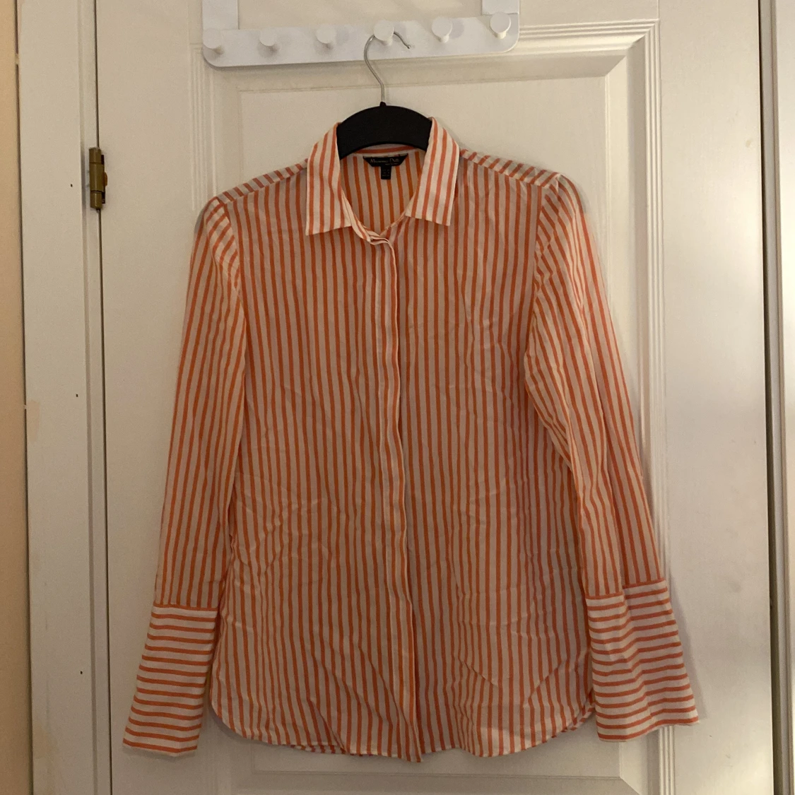 Säljer en snygg skjorta från Massimo Dutti i vitt och orange röd färg med vertikala ränder. Skjortan har klassisk krage, långa ärmar och knappar framtill. Perfekt för dig som gillar stilrena och färgglada plagg.