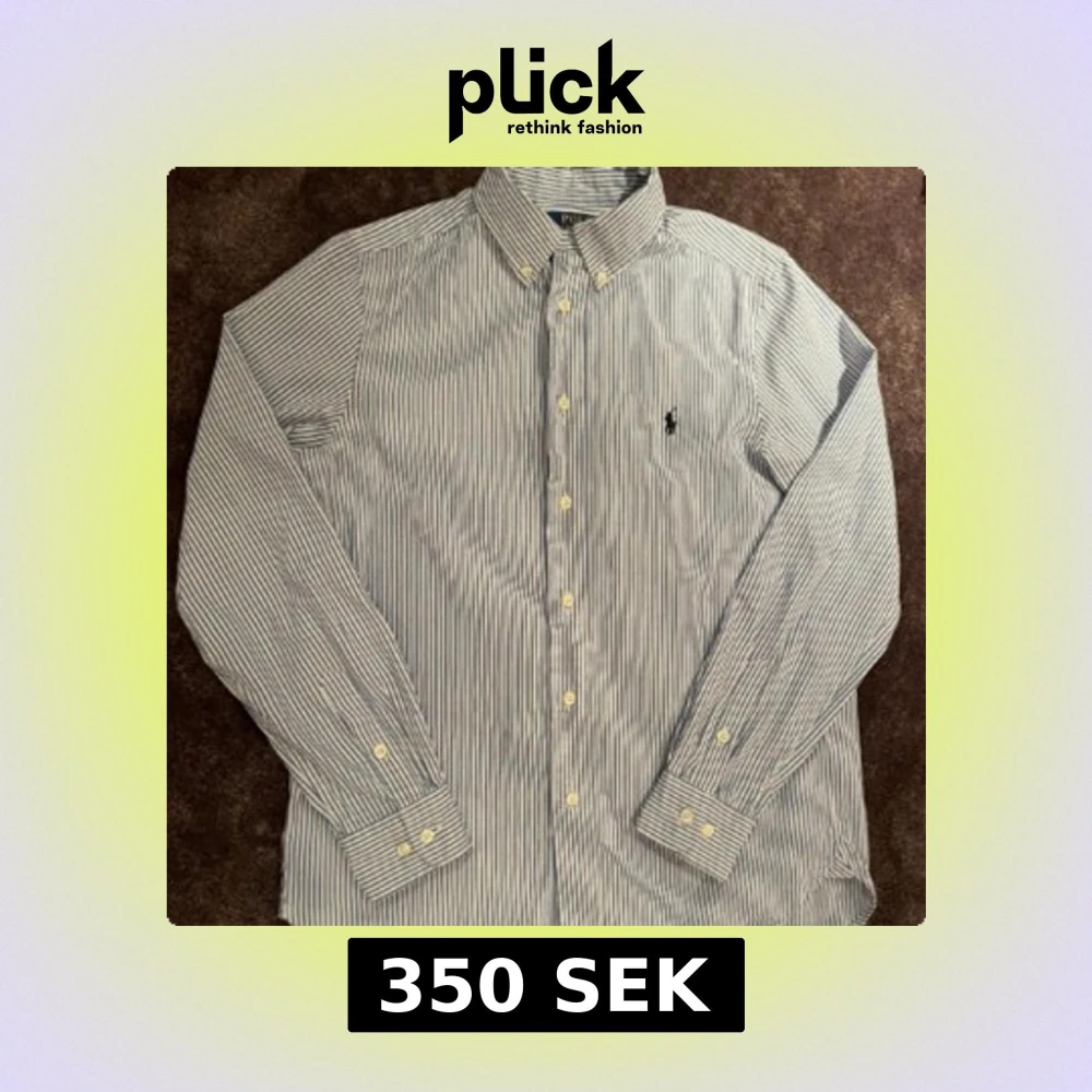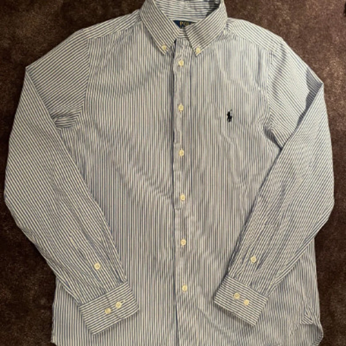 Klassisk blå- och vitrandig skjorta från Polo Ralph Lauren med button down-krage och broderad logga på bröstet. Skjortan har långa ärmar, knappar framtill och är tillverkad i bomull. Perfekt för en clean och stilren look. Storlek 16(m)