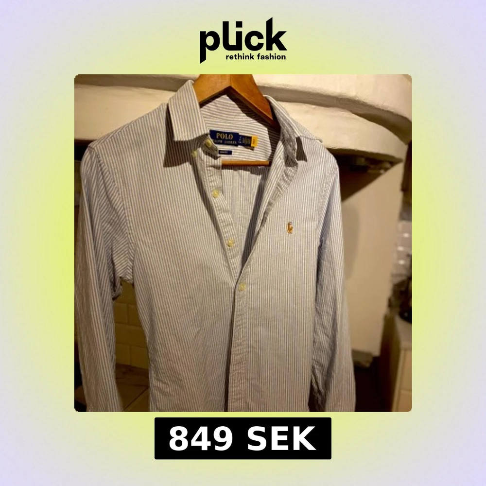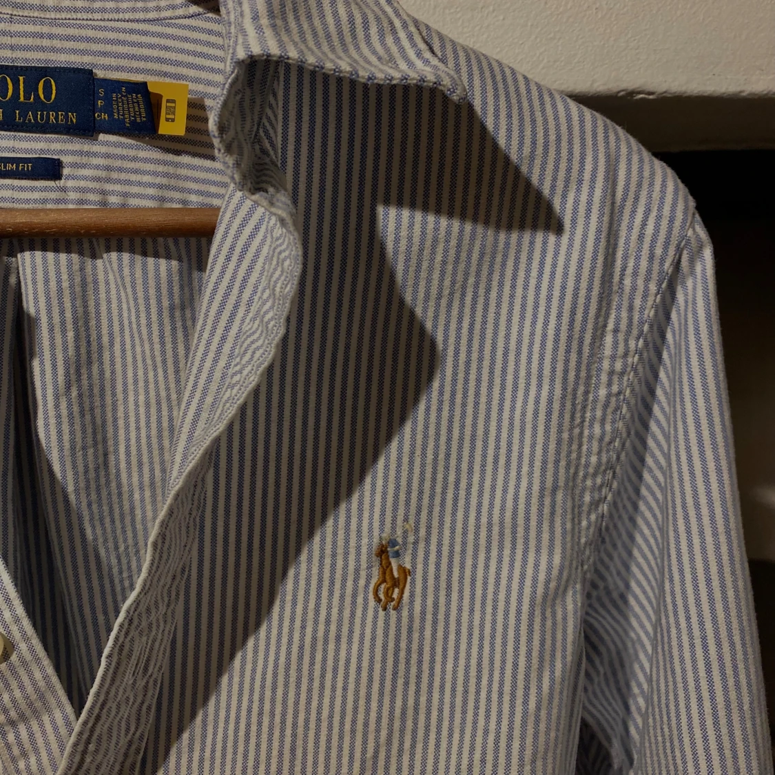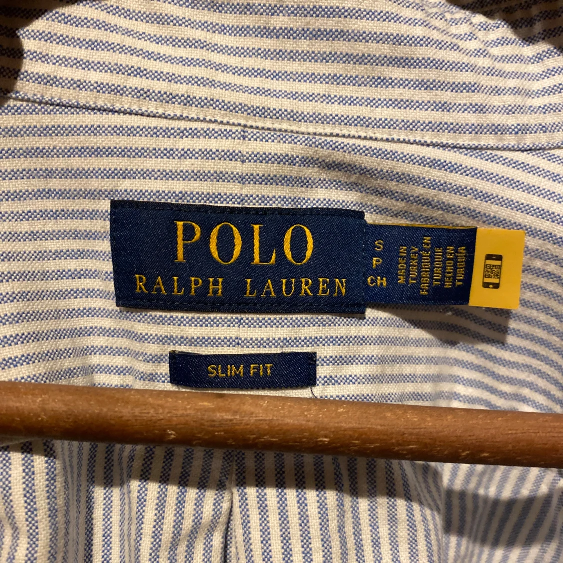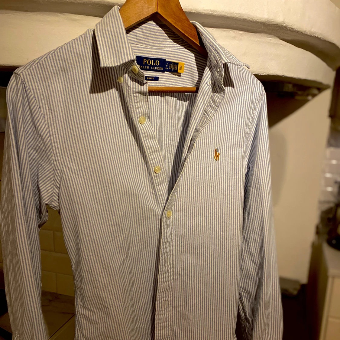 Säljer en klassisk slim fit skjorta från Polo Ralph Lauren i vitt och blått med tunna ränder. Skjortan har lång ärm, knappar framtill och den ikoniska broderade loggan på bröstet. Perfekt för dig som gillar stilrena och tidlösa plagg.