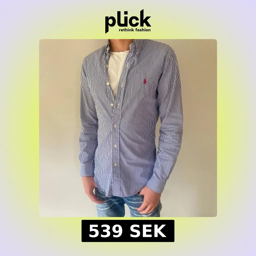 Snygg blå- och vitrandig skjorta från Ralph Lauren Skjortan har lång ärm och den ikoniska röda loggan broderad på bröstet. Perfekt för en stilren och avslappnad look. Skriv vid, minsta fråga!