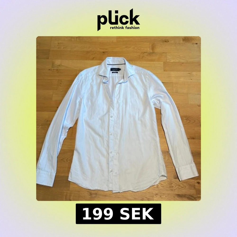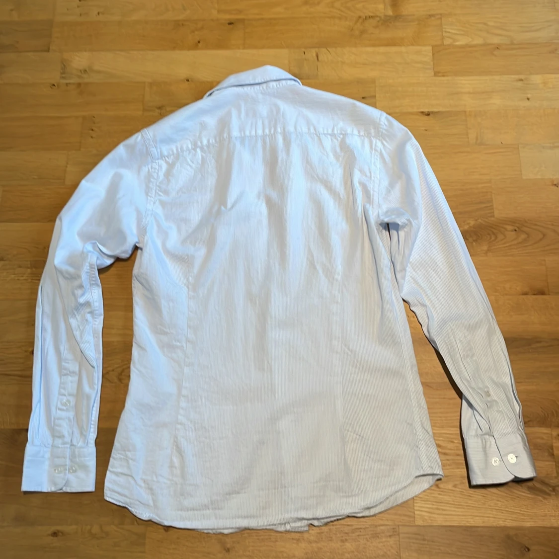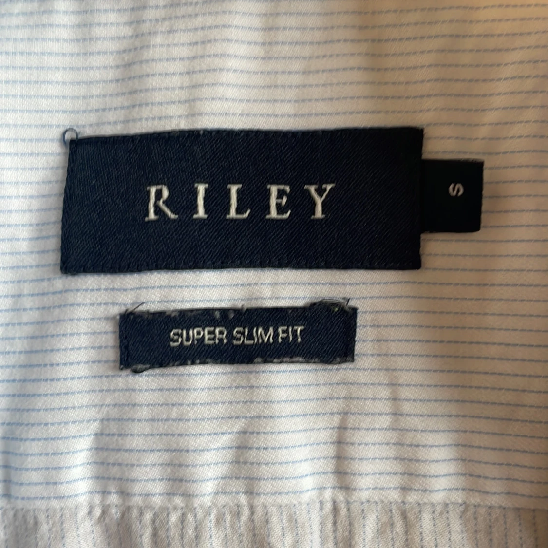 Vit skjorta från Riley i super slim fit med tunna ljusblå ränder. Klassisk krage, långa ärmar med manschett och knappar framtill. Skjortan är gjord i mjuk bomull och har en stilren, smal passform som sitter snyggt på kroppen. Storlek: super slim S. Skick: 10/10. Knappt använd.
