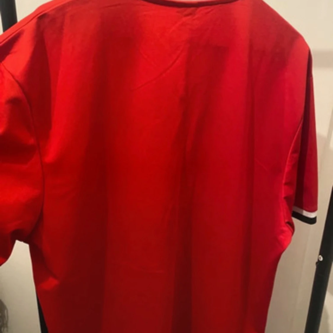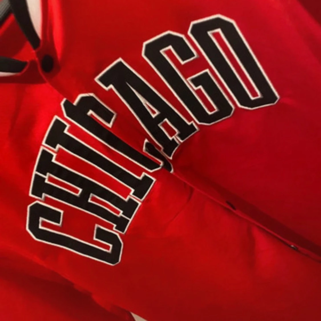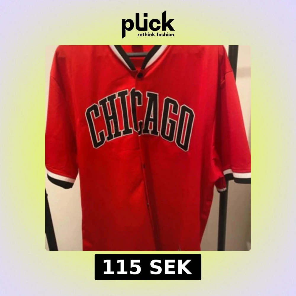 Röd baseballinspirerad skjorta från FSBN i storlek XL med svartvita detaljer på krage och ärmslut. Stort CHICAGO-tryck framtill, knappar hela vägen och loose fit. Perfekt för dig som gillar sportig streetstyle.