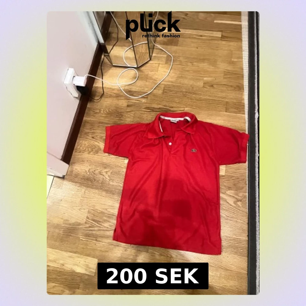 Säljer en röd piké t-shirt från Lacoste med klassisk krage och två knappar framtill. T-shirten har korta ärmar och den ikoniska krokodilloggan broderad på bröstet. Perfekt för dig som gillar sportig och stilren design.