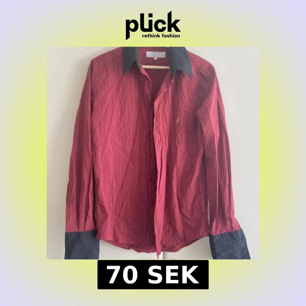 Snygg röd skjorta från Poca Loco med svarta tunna ränder, svart krage och svarta muddar. Klassisk passform med knappar framtill och diskret logga på bröstet. Perfekt för dig som vill sticka ut lite extra med kontrastdetaljer.