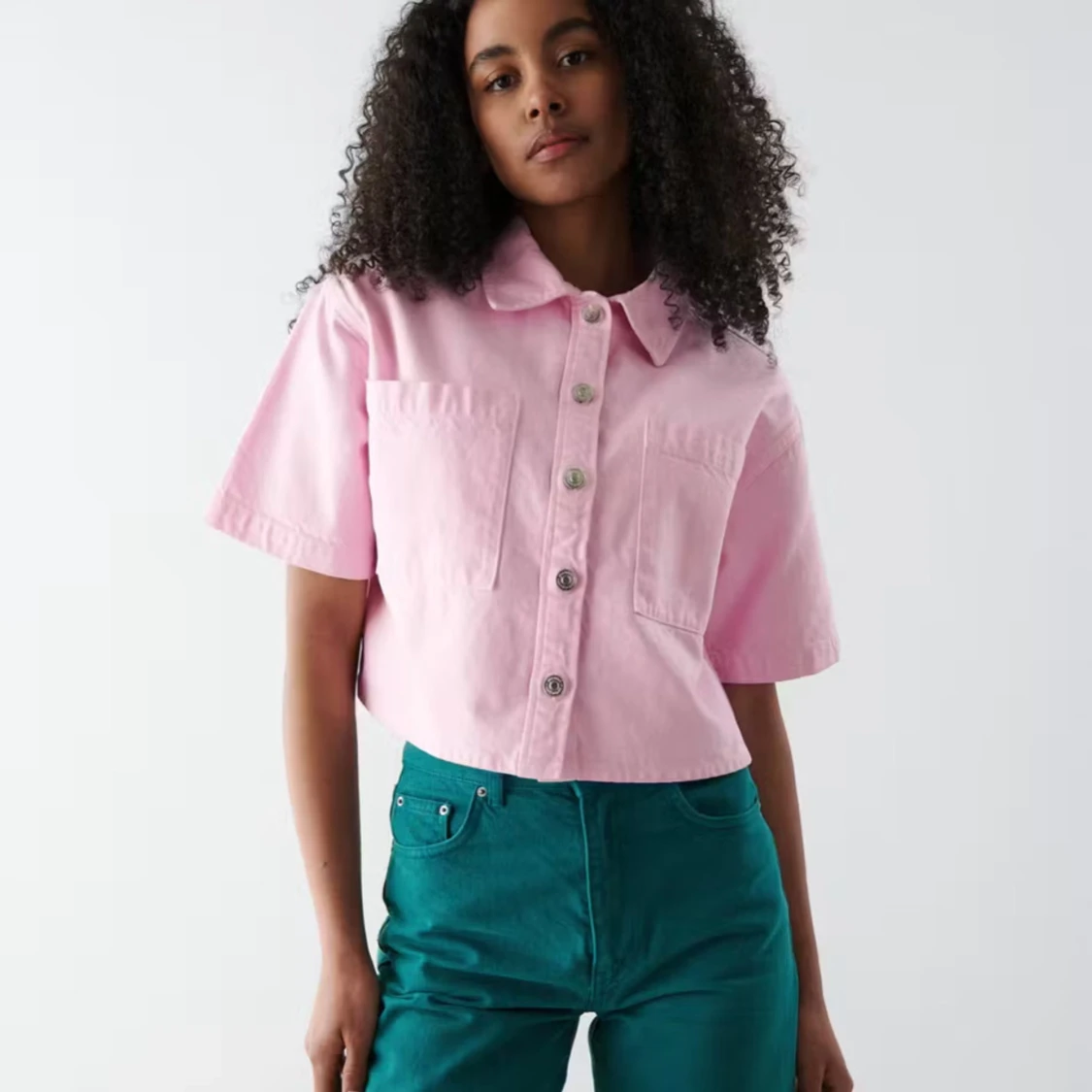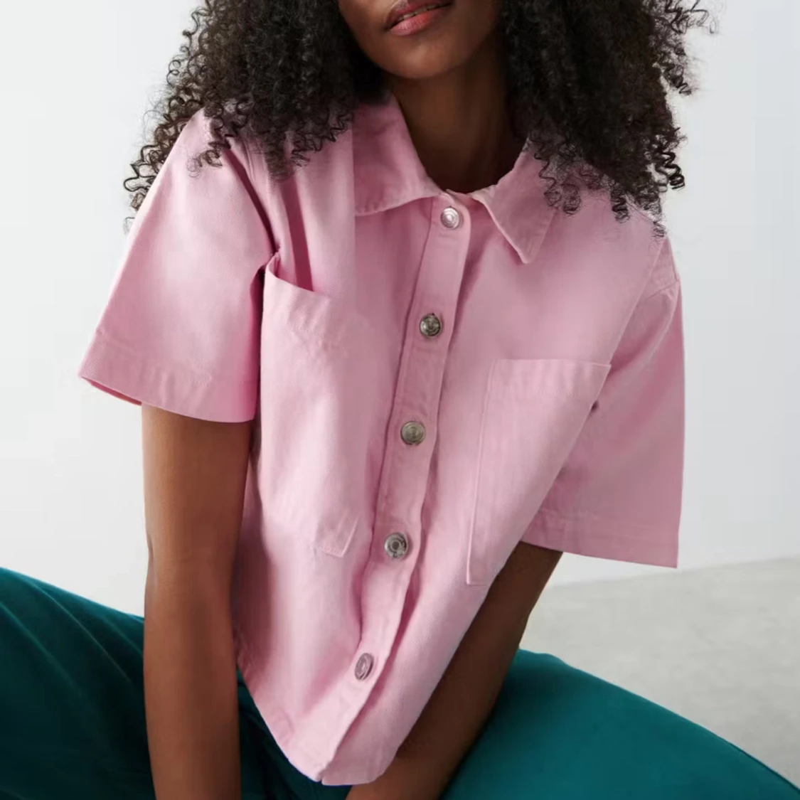 Snygg rosa skjorta med korta ärmar och stora knappar framtill. Skjortan har en klassisk krage och två stora bröstfickor. Perfekt för en avslappnad stil.
