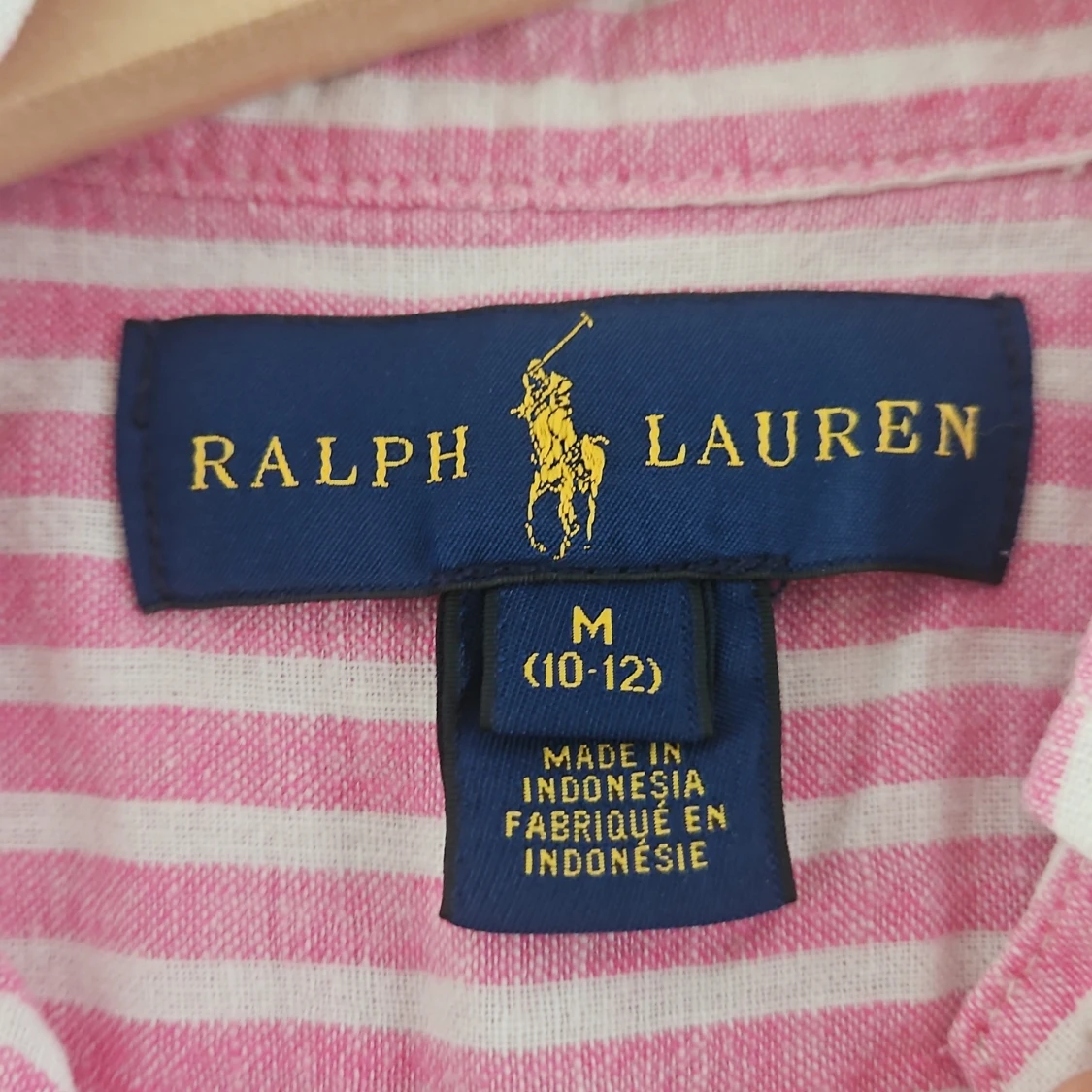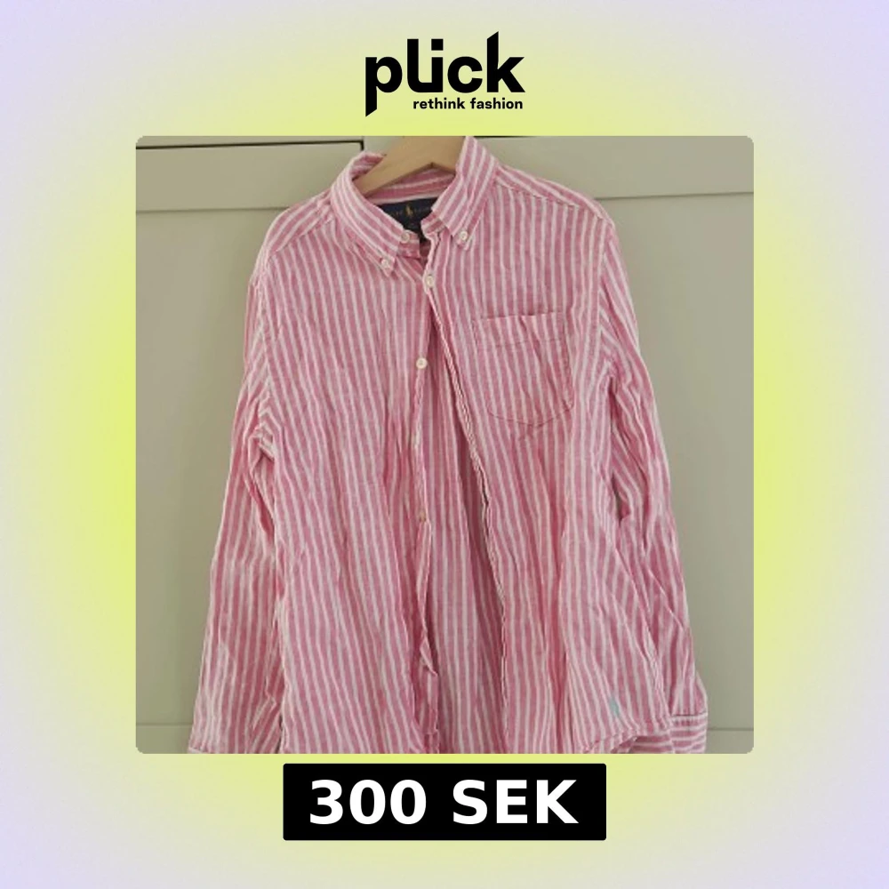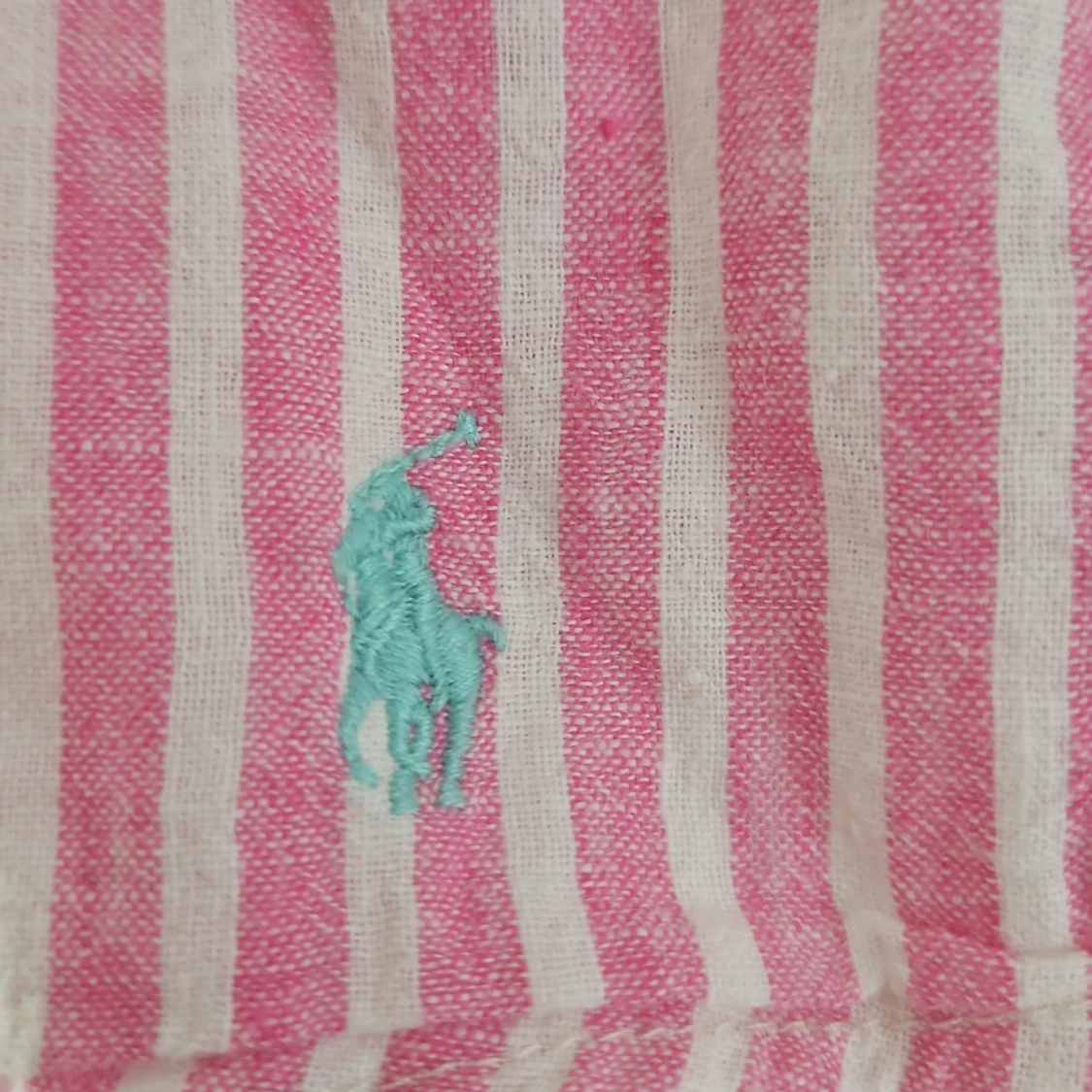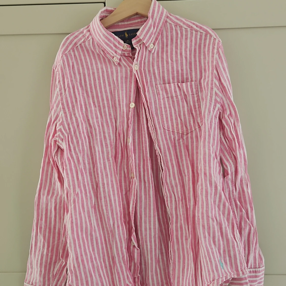 Snygg rosa och vit randig skjorta från Ralph Lauren i luftig linnemix. Klassisk button-down krage, bröstficka och broderad logga i turkos på ärmen. Perfekt för en fräsch och avslappnad stil.