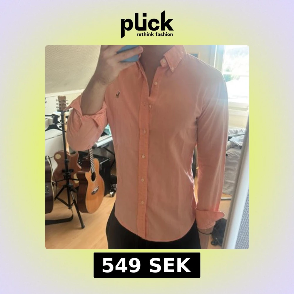 Säljer en laxrosa skjorta från Ralph Lauren med klassisk button-down krage och broderad logga på bröstet. Skjortan har långa ärmar och vita knappar framtill. Perfekt för en stilren look.
