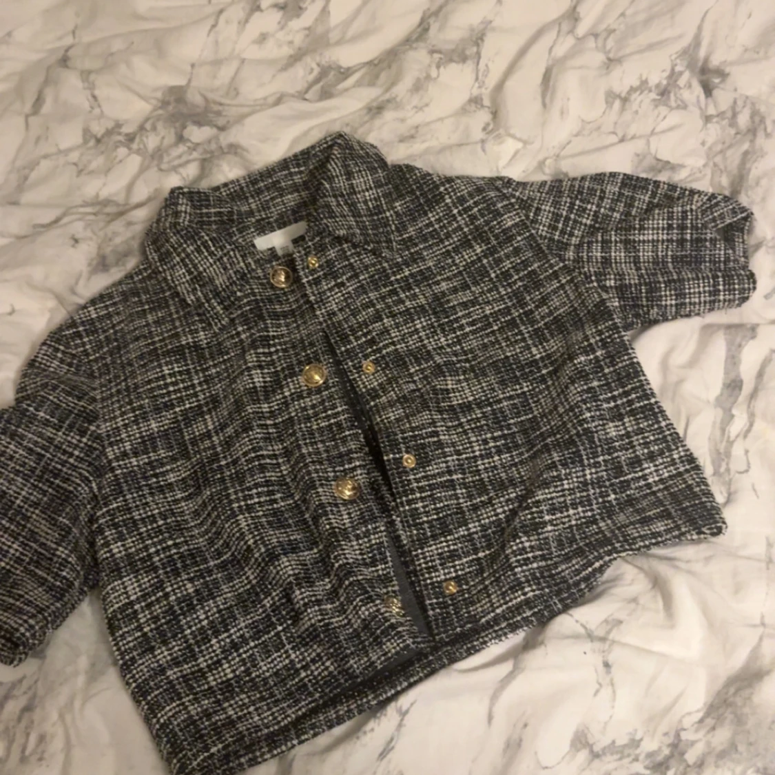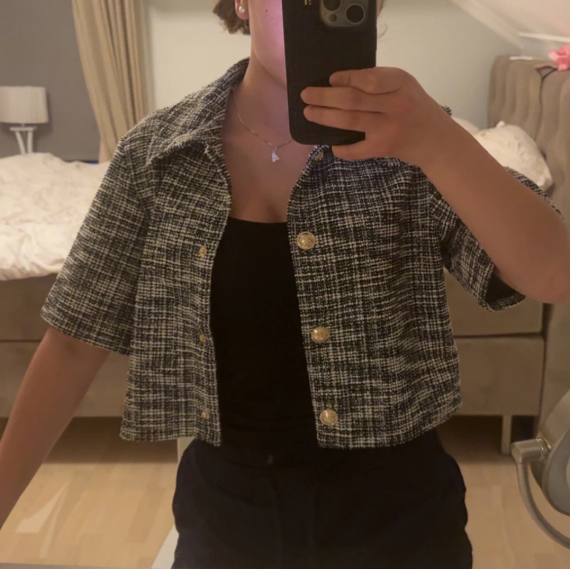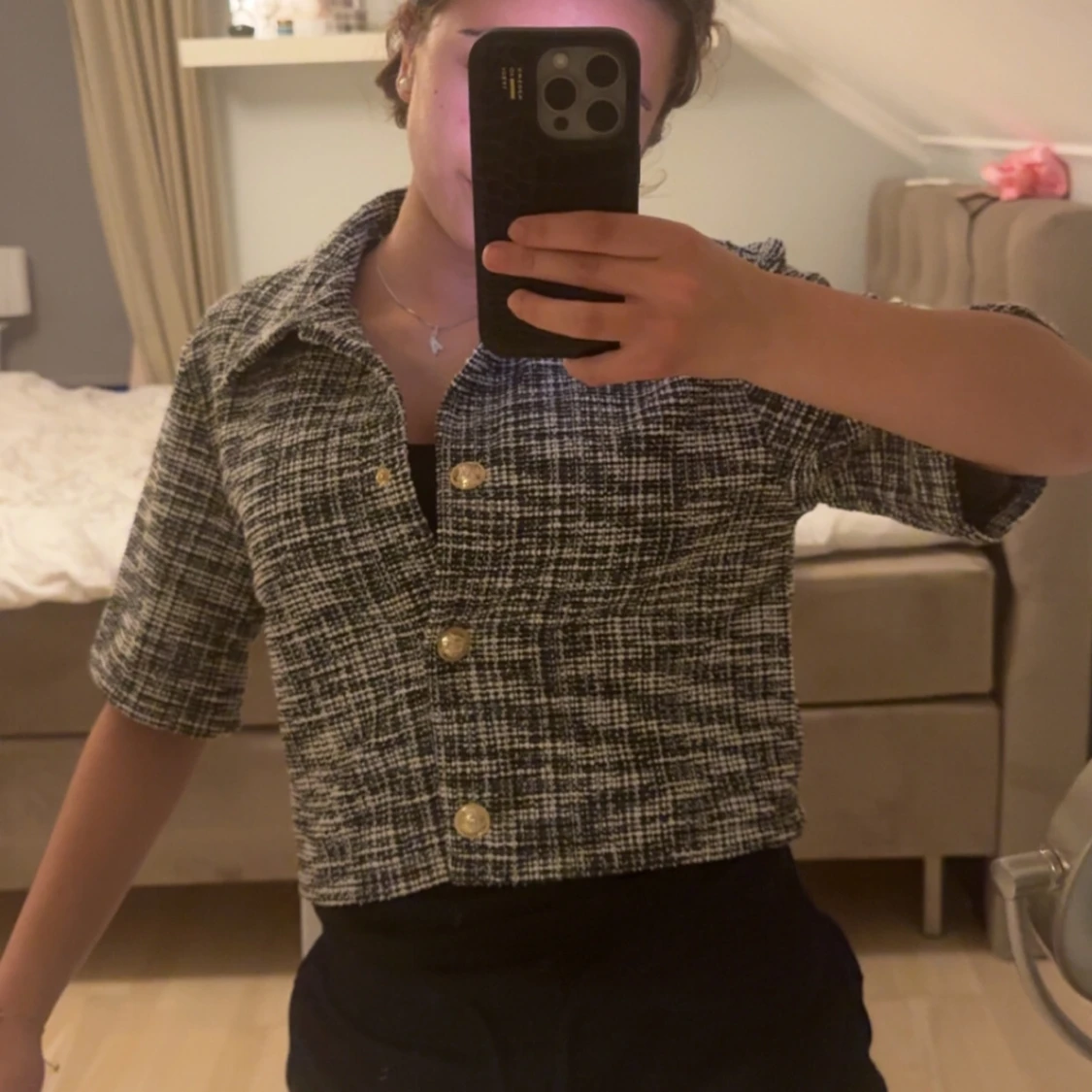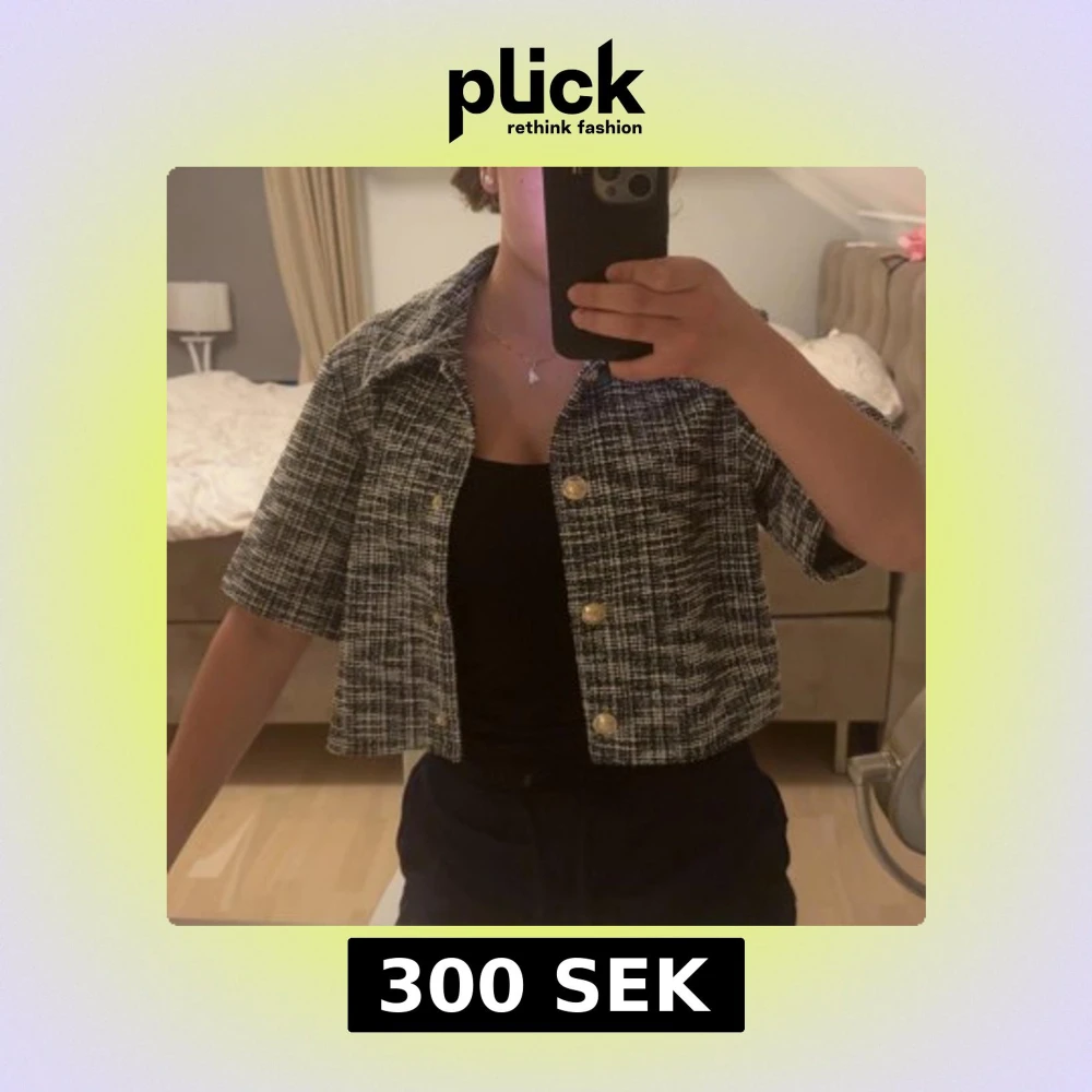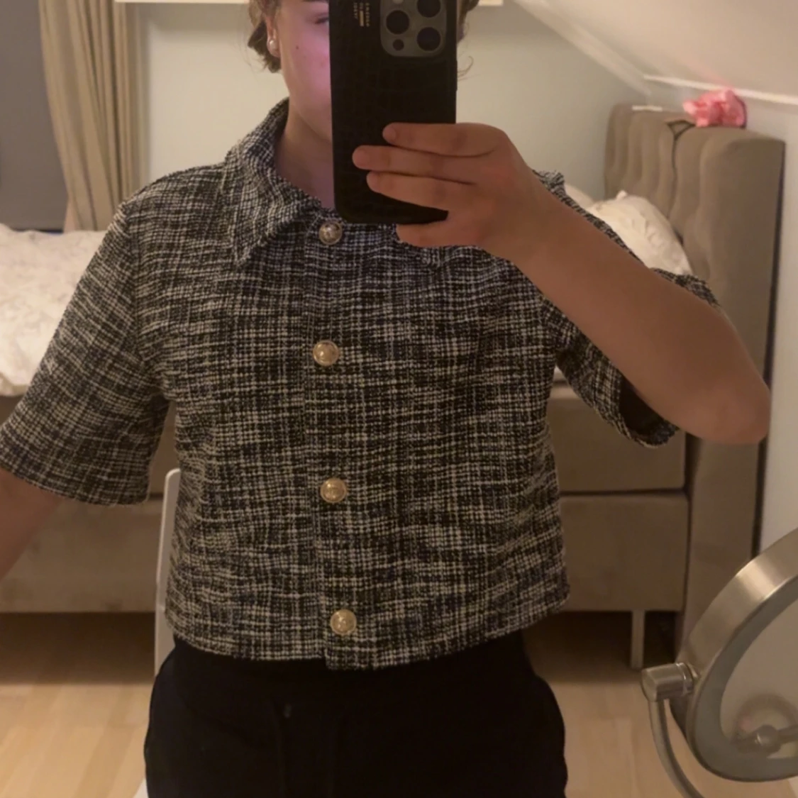Snygg croppad overshirt från H&M i svartvitt rutigt mönster. Jackan har korta ärmar, klassisk krage och guldiga knappar framtill. Perfekt för att lyfta din outfit med en trendig touch. Aldrig använd !