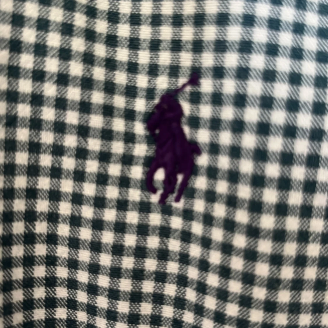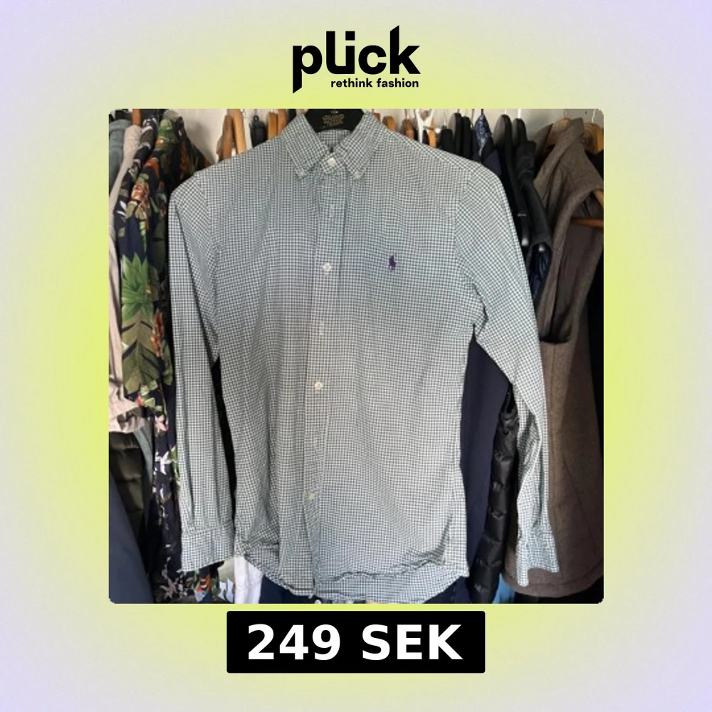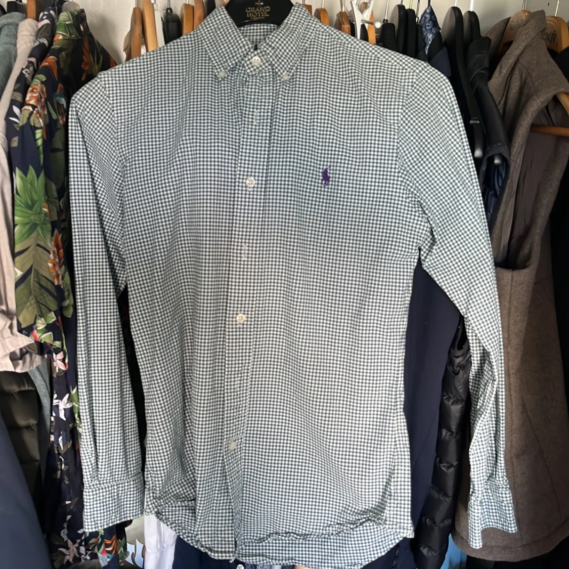 Säljer en grön och vit rutig skjorta från Polo Ralph Lauren i slim fit. Skjortan har klassisk krage, knappar framtill och broderad lila logga på bröstet. Tillverkad i stretchig bomull för extra komfort. Perfekt för dig som gillar stilren och tidlös look.