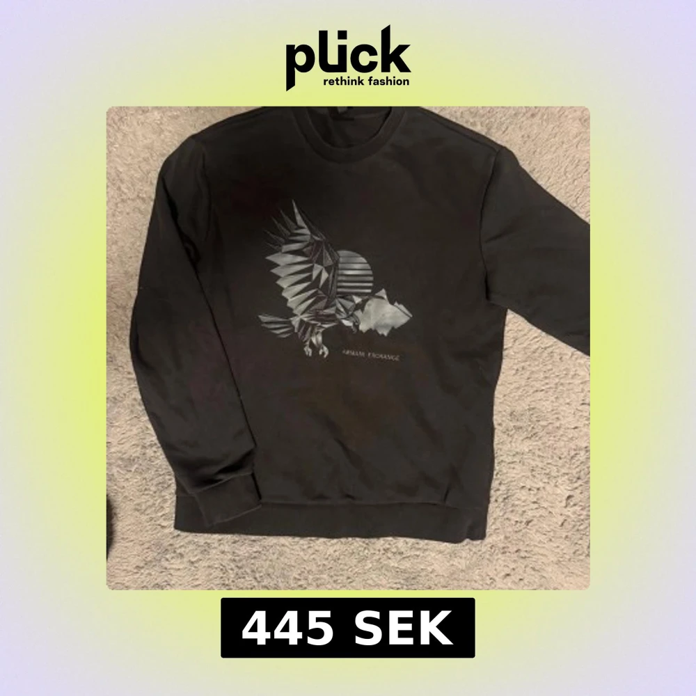 Svart sweatshirt från Armani Exchange i storlek S med ett stilrent geometriskt örnmotiv i silver på bröstet. Tröjan har rund hals, långa ärmar och ribbade muddar. Perfekt för dig som gillar grafiska prints och vill ha en cool streetstyle-look.