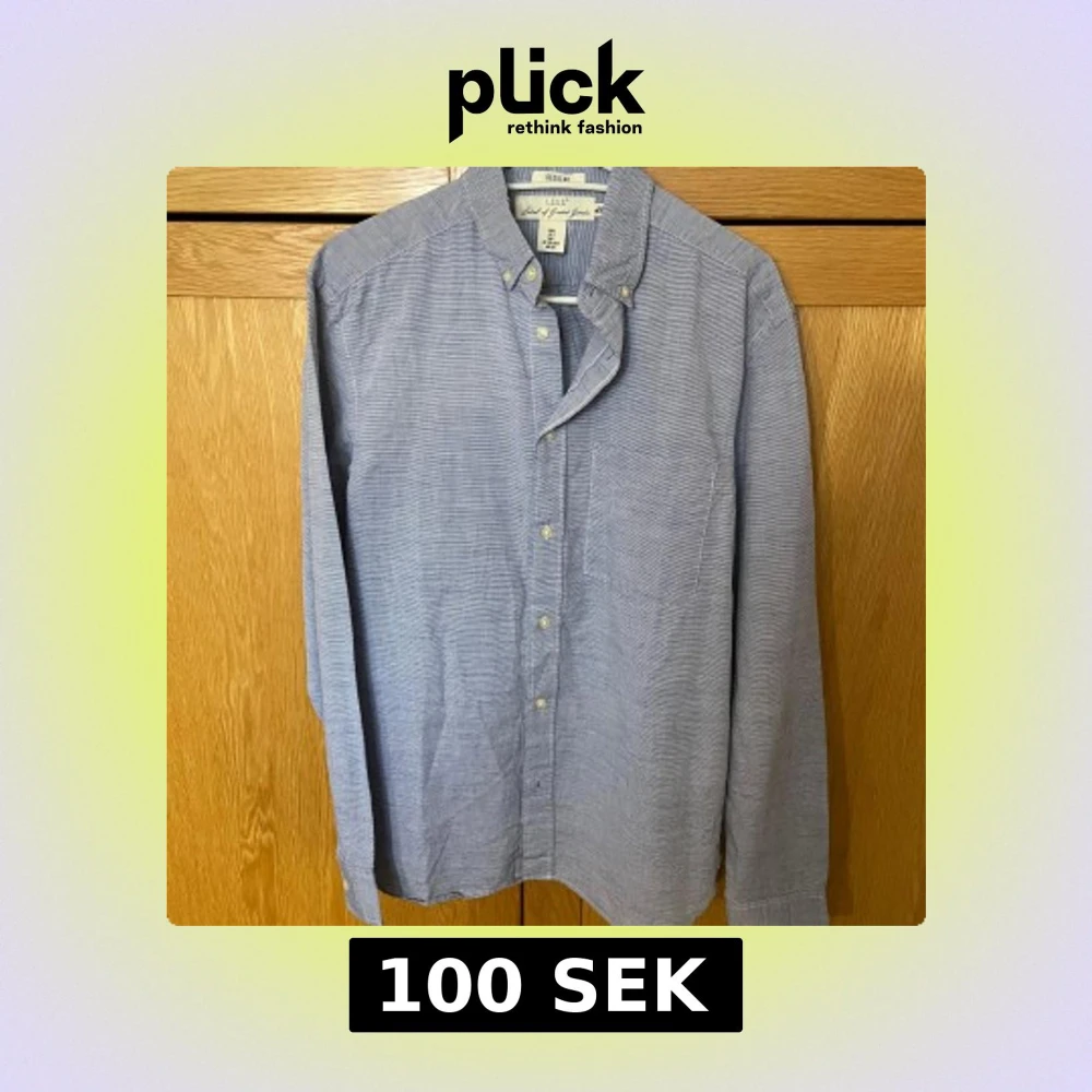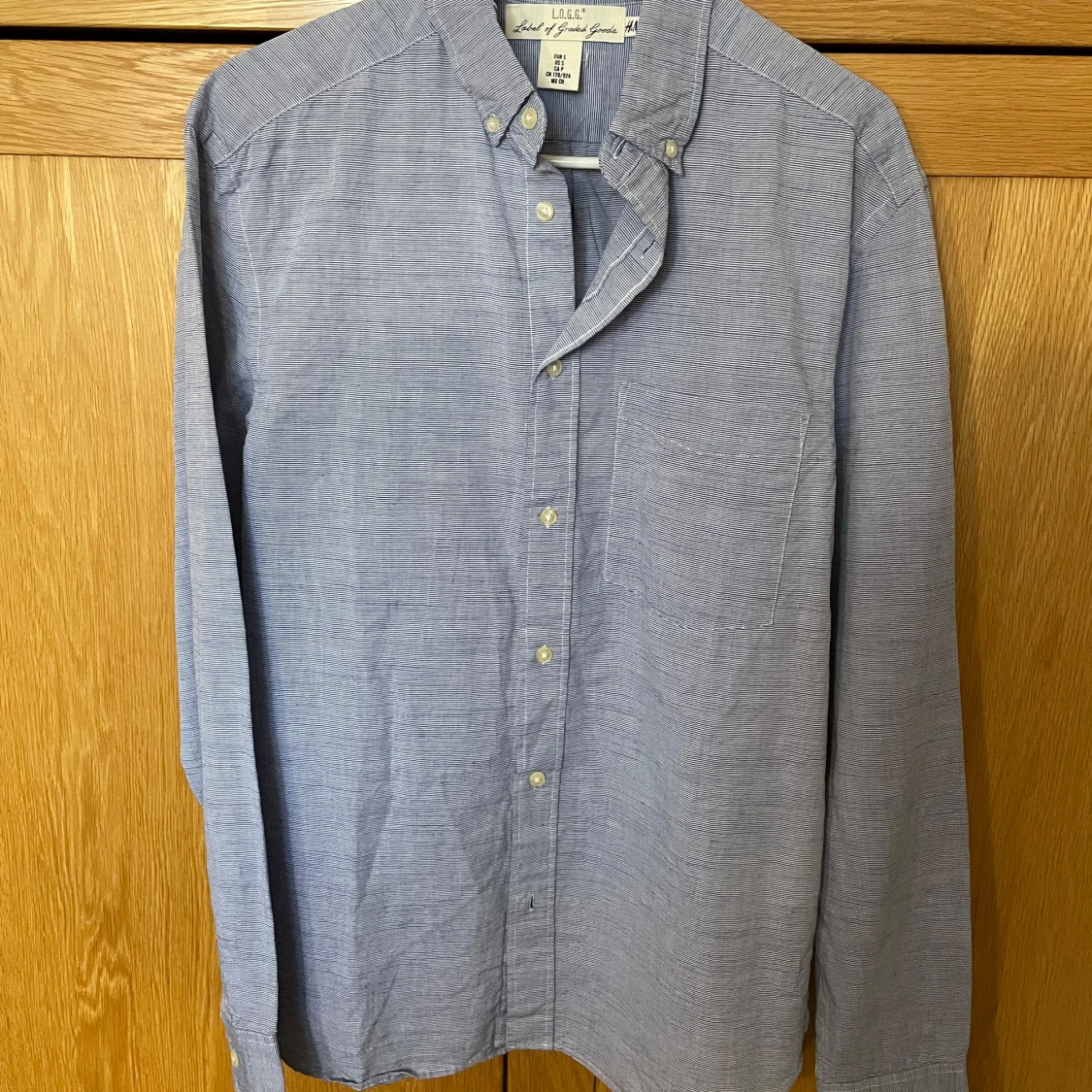 Säljer en stilren blå skjorta från L.O.G.G. med diskreta ränder, klassisk button-down krage och bröstficka. Skjortan är långärmad och har knappar framtill. Perfekt för dig som gillar en clean och enkel look.