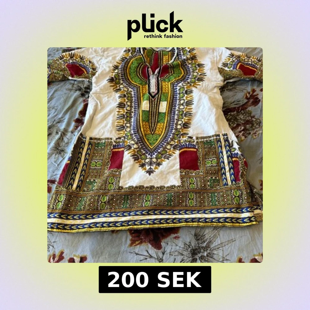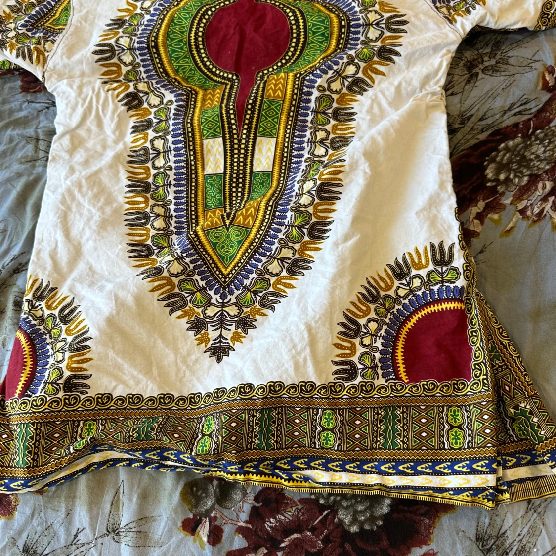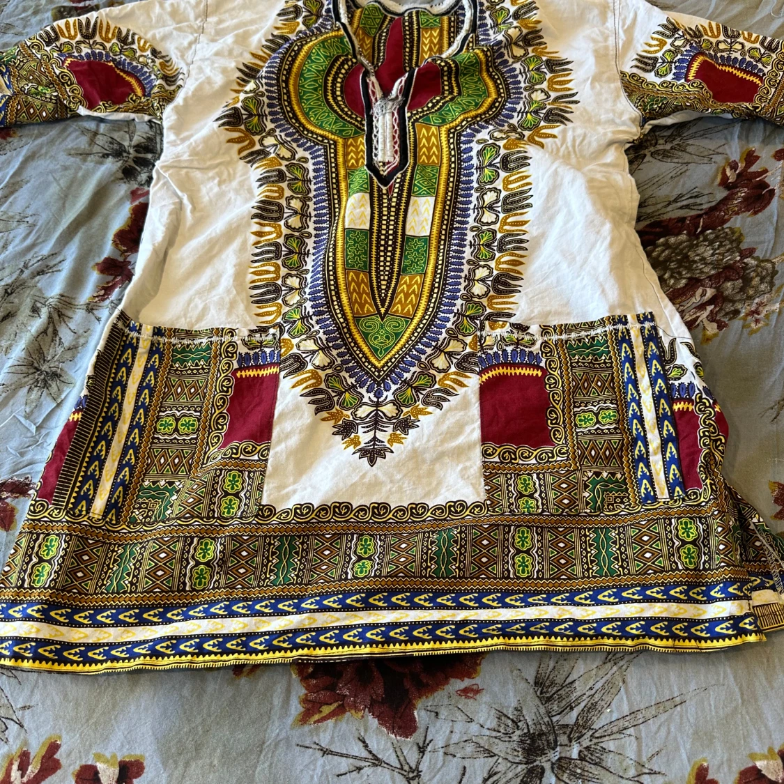 Unik henley-skjorta med färgstarkt afrikanskt mönster i vitt, grönt, gult, blått och rött. Skjortan har lång ärm, v-ringning med snörning och detaljerade tryck längs kanter och bröst. Perfekt för dig som vill sticka ut med en riktigt cool och färgglad look.