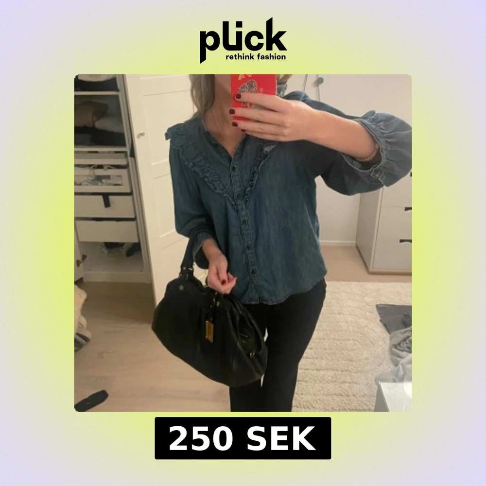 Snygg blå jeansblus med volangdetaljer längs kragen. Aldrig använd och i storlek S!