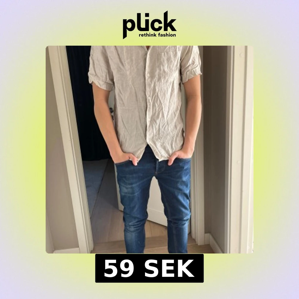 Säljer en stilren beige skjorta i linne med korta ärmar och knappar framtill. Perfekt för varma dagar med sin lätta och luftiga känsla. Skjortan är i storken S