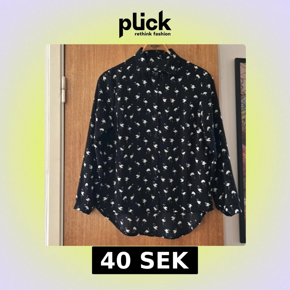 Svart skjorta med vita flamingos över hela tyget. Skjortan har klassisk krage, knappar framtill och långa ärmar med knapp vid manschetten. Materialet är lätt och har en lite skrynklig struktur som ger en cool vibe. Perfekt för dig som gillar unika prints och vill sticka ut.