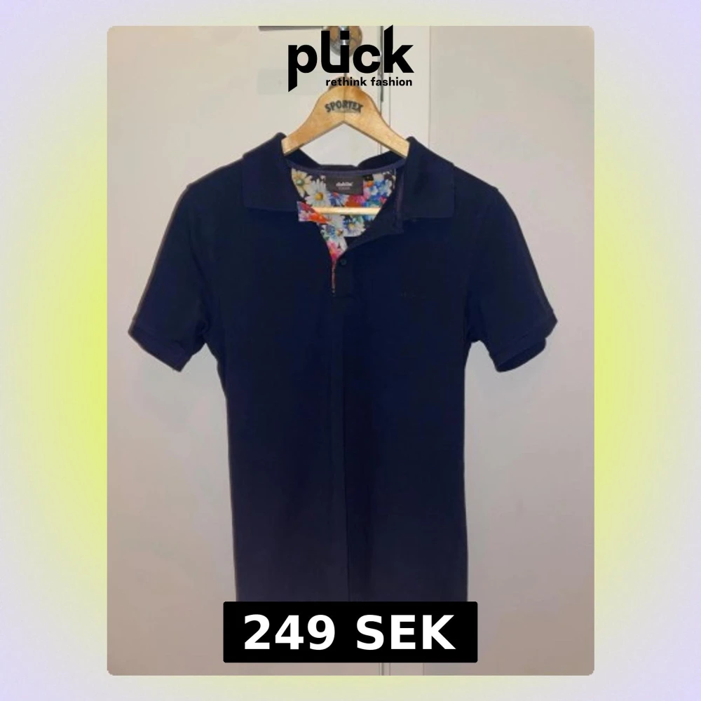 Snygg mörkblå pikétröja från Dahlin by Eberstal med korta ärmar och krage. Insidan av knappslån har ett färgglatt blommigt tyg som ger en unik touch. Perfekt för dig som vill ha något stilrent men ändå med lite extra detaljer. Använd 1-2 gånger så utmärkt skick.