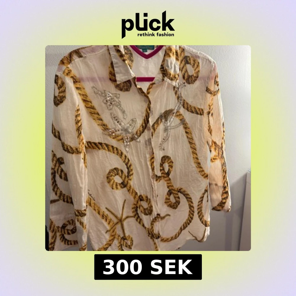 Säljer en unik vit blus från Antica Sartoria med ett iögonfallande repmönster i brunt och detaljer av paljetter. Blusen har långa ärmar och knappar framtill. Perfekt för dig som vill sticka ut med en stilren men ändå lekfull look.
