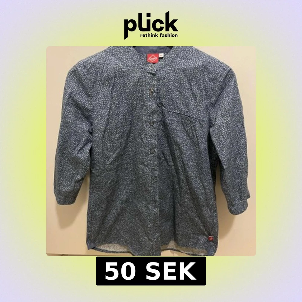 Säljer en blå skjorta från Segers med diskret mönster och knappar framtill.