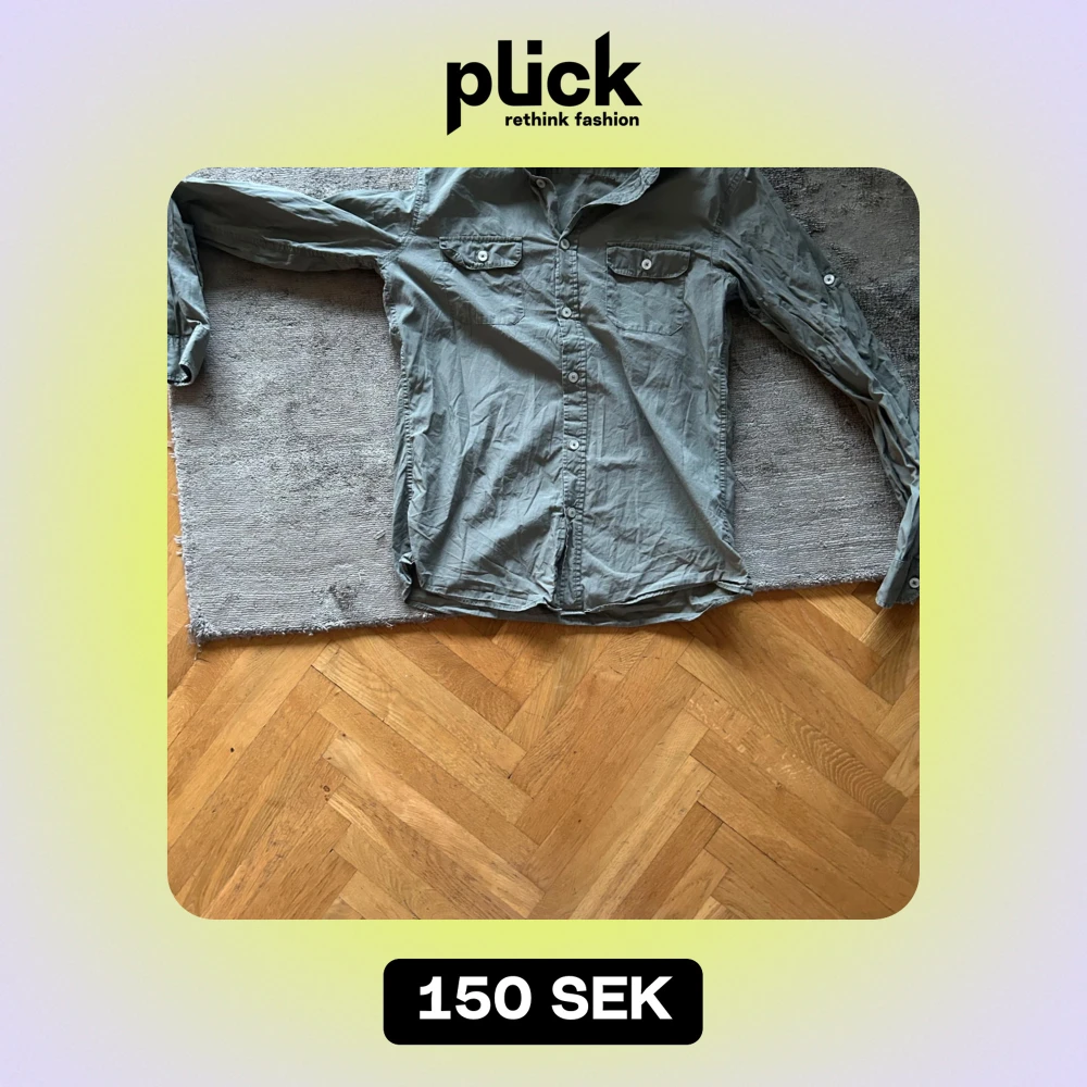 Säljer en grön långärmad skjorta i bomull. Skjortan har knappar framtill och två bröstfickor med lock. Perfekt för en avslappnad stil och passar bra till jeans. Skjortan är i bra skick och har en normal passform.