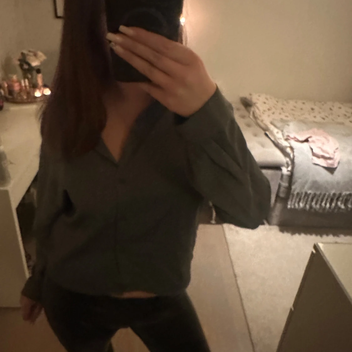 Säljer en grön satinliknande skjorta med knappar framtill. Skjortan har långa ärmar och en klassisk krage. Perfekt för en avslappnad men ändå uppklädd look.