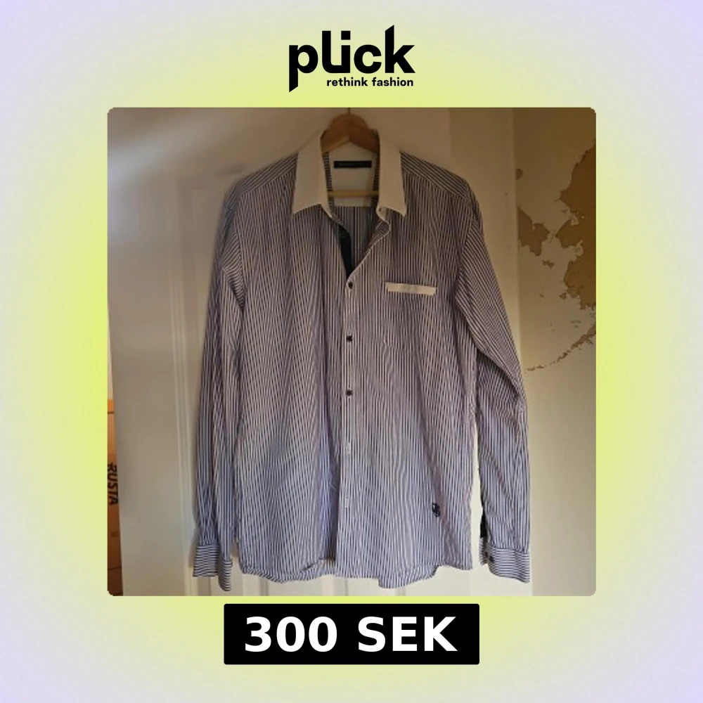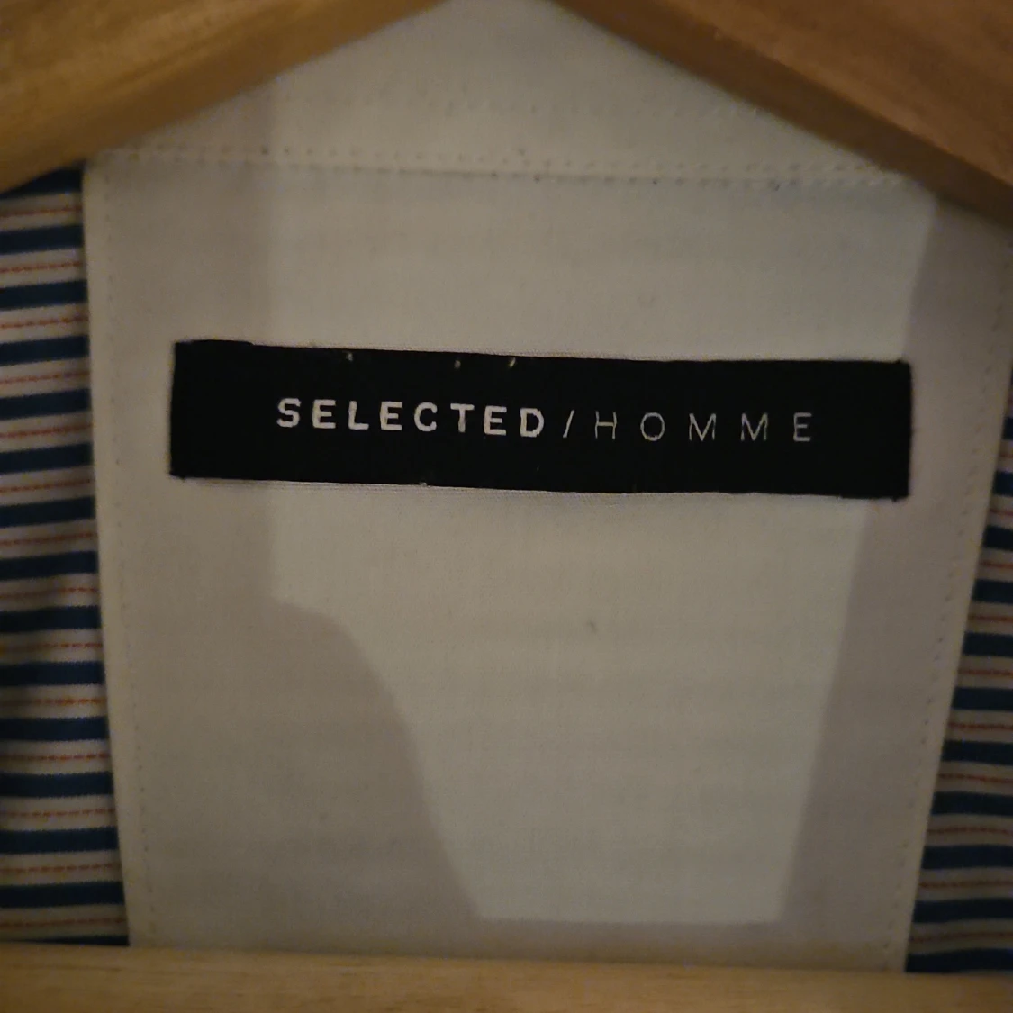 Snygg skjorta från Selected Homme med blå och vita ränder, kontrasterande vit krage och bröstficka med vit kant. Klassisk passform och långa ärmar, perfekt för en stilren look. Skjortan har knäppning framtill och är tillverkad i mjuk bomull.