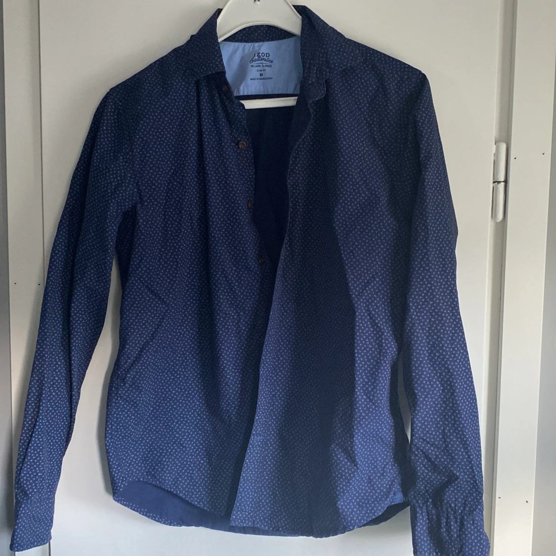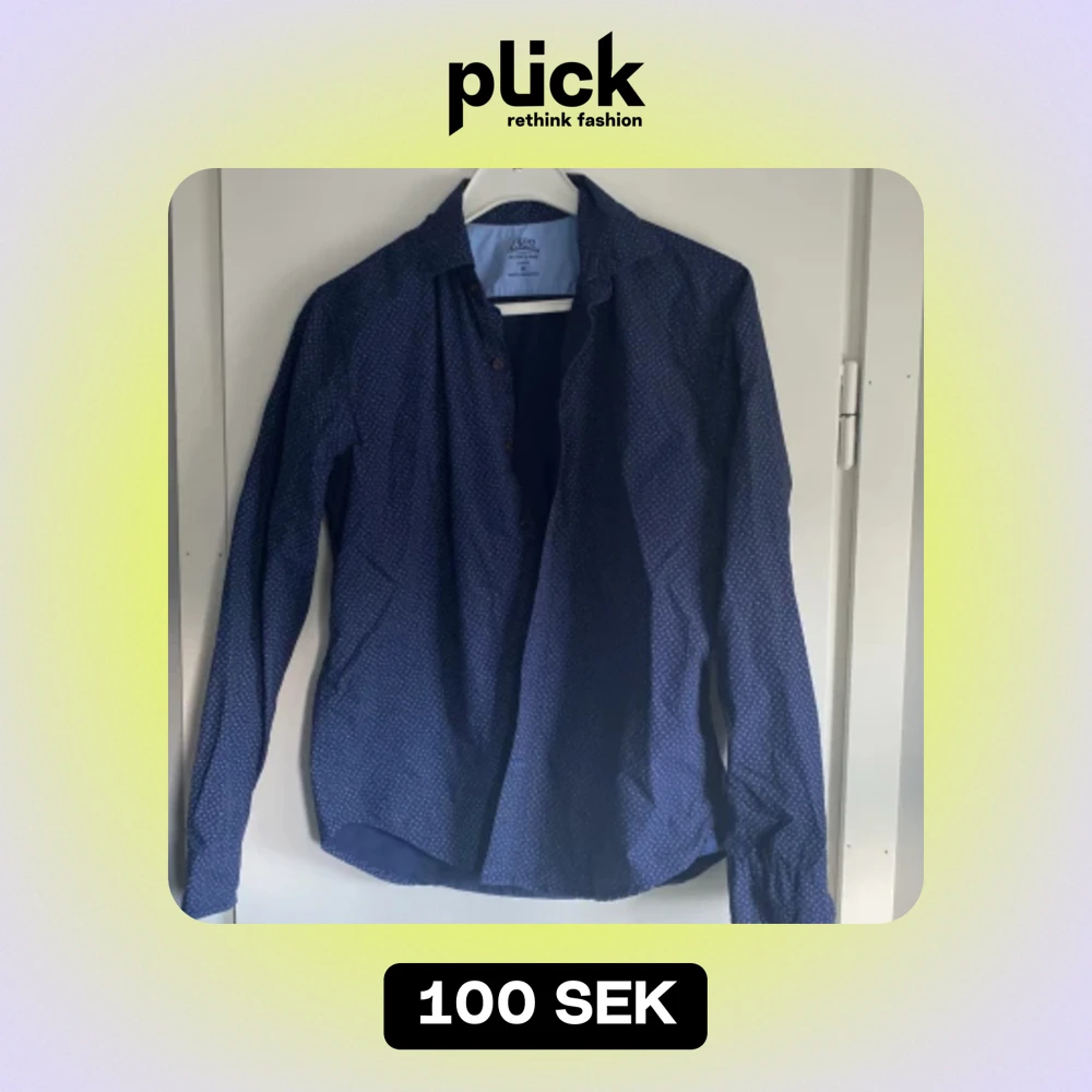 Nyskick. Marinblå skjorta med diskret mönster. Detaljfoto taget så mönstret syns