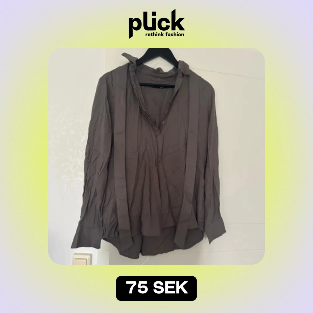 Skjorta/blus med knytning. Bandet är avtagbart (se bild). Svårt att få rättvis bild på färgen men där är grå/grön. Endast använd ett fåtal gånger så den är hel och fräsch!