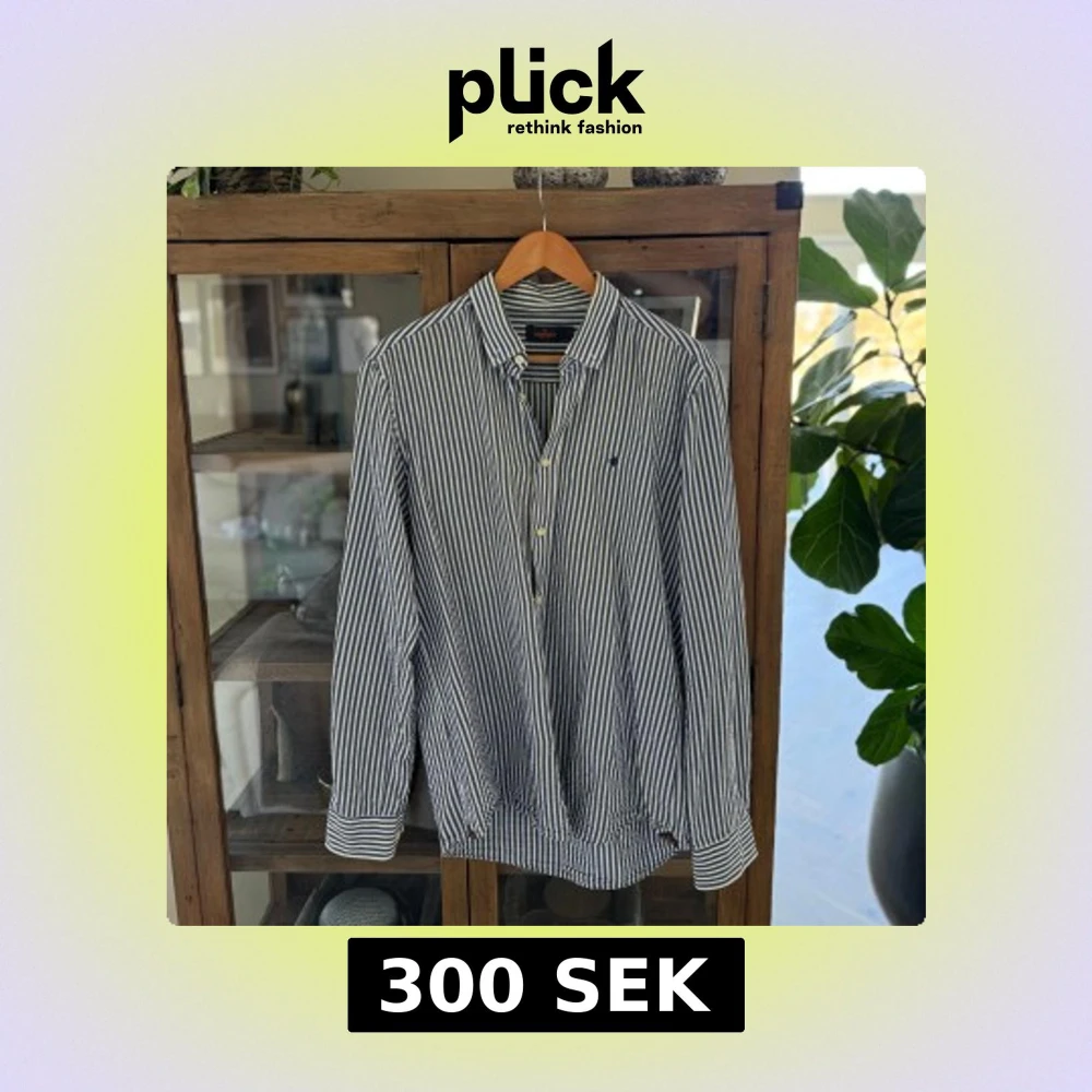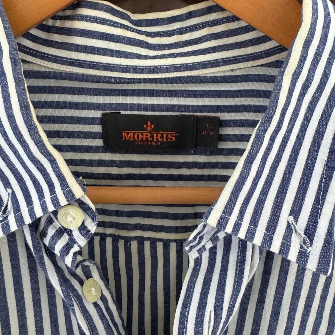 Snygg randig skjorta från Morris i blått och vitt. Skjortan har långa ärmar och knappar framtill. Perfekt för en stilren look. Sällan använd där av säljs den. Storlek L