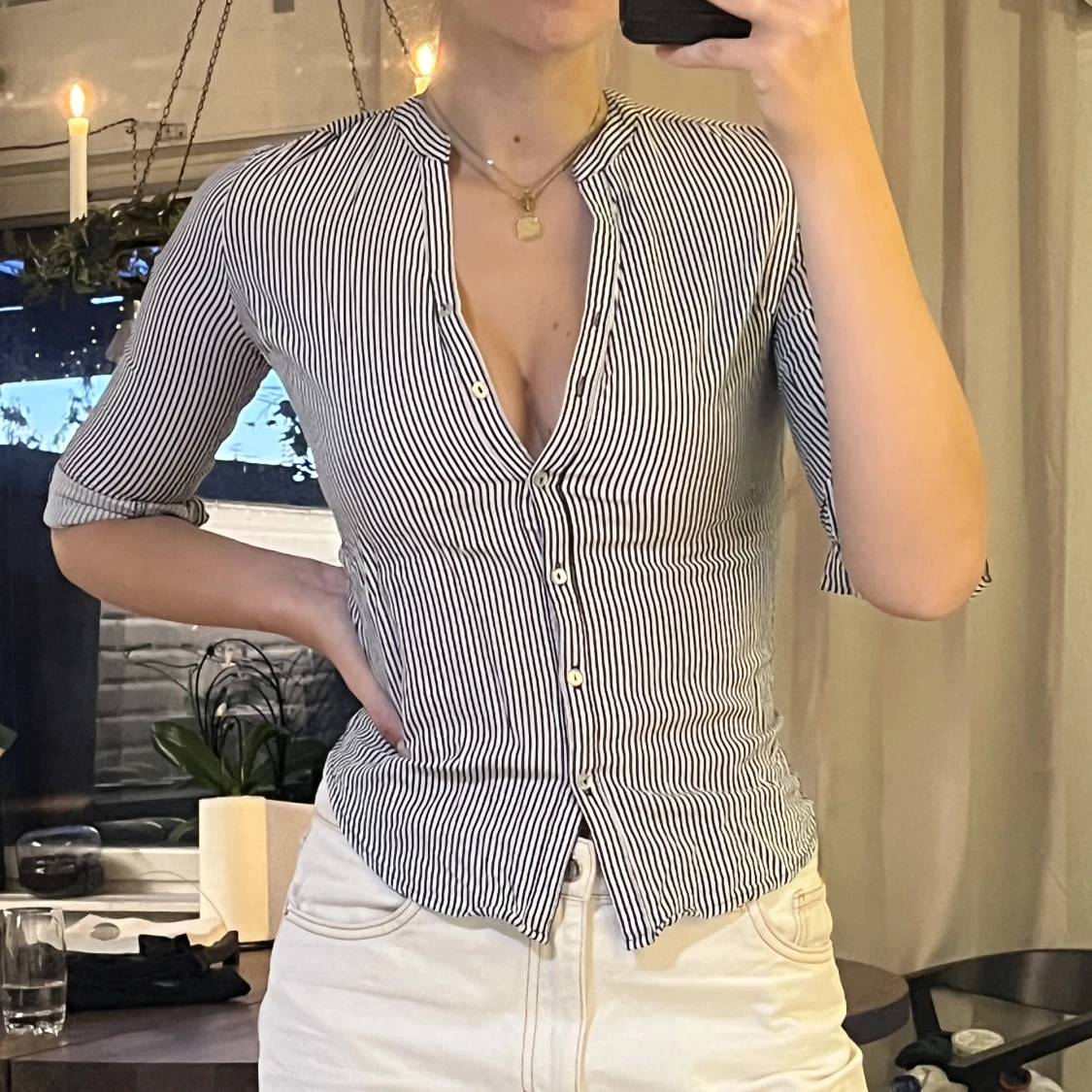 Superfin svartvit skjorta och den sitter som en smäck runt kroppen. Jag säljer den nu för att den börjar bli för liten.