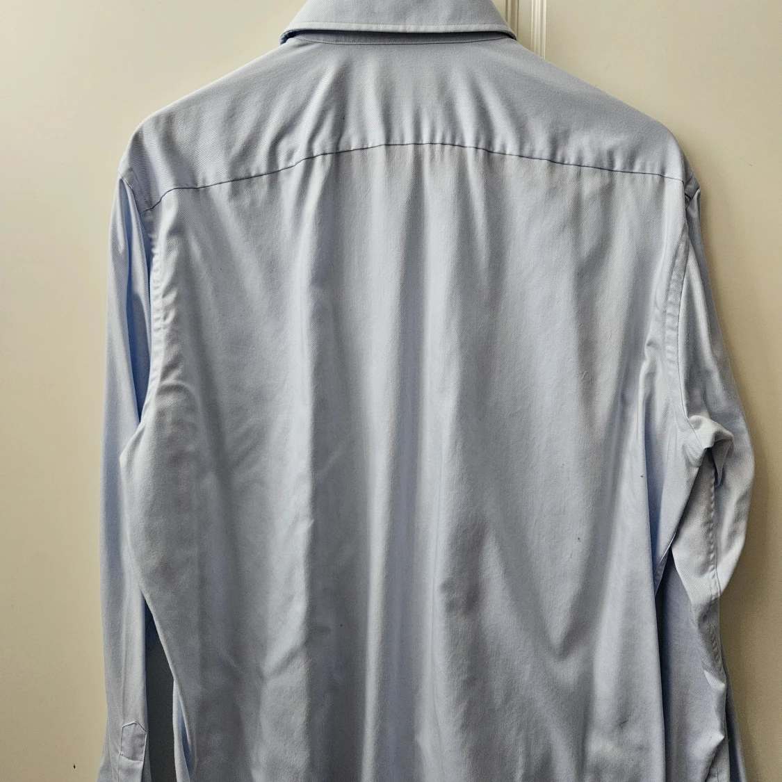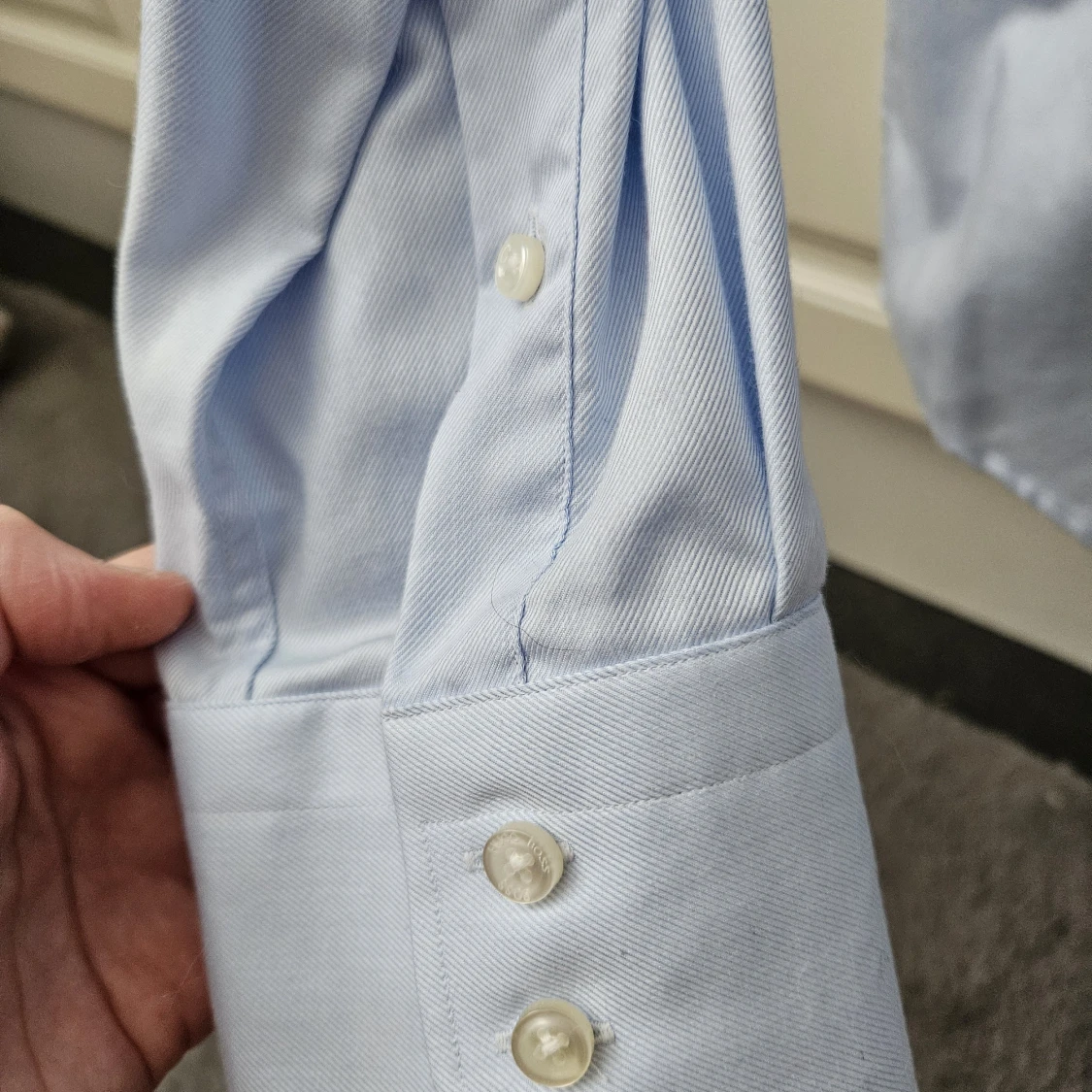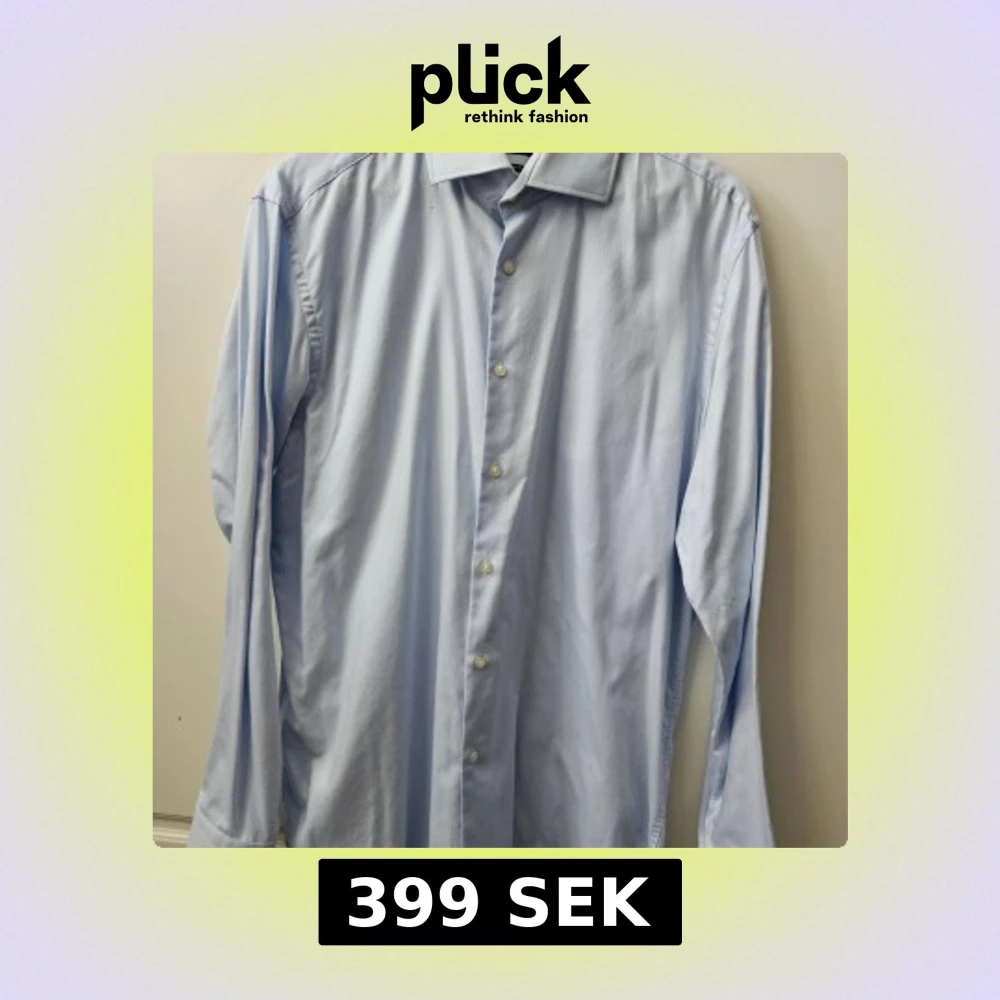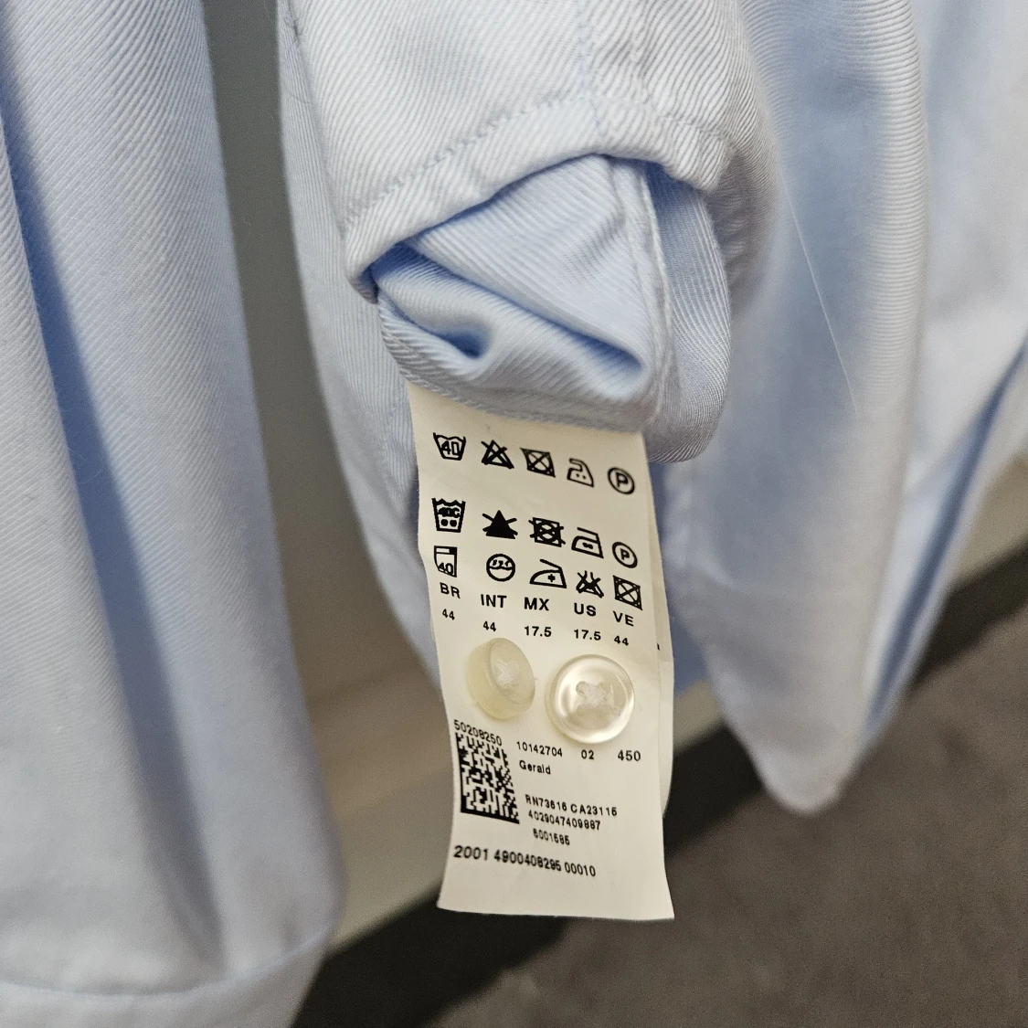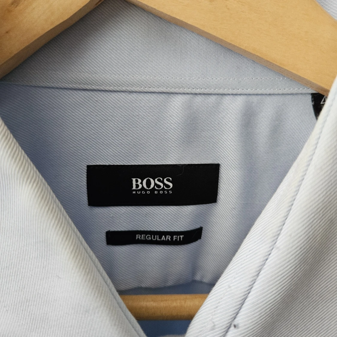 Ljusblå skjorta från Hugo Boss i modellen Regular Fit. Skjortan har långa ärmar och knappar framtill. Nypris 1199 kr. Se sista bild där det har gulnat på kragen. Annars I fint skick