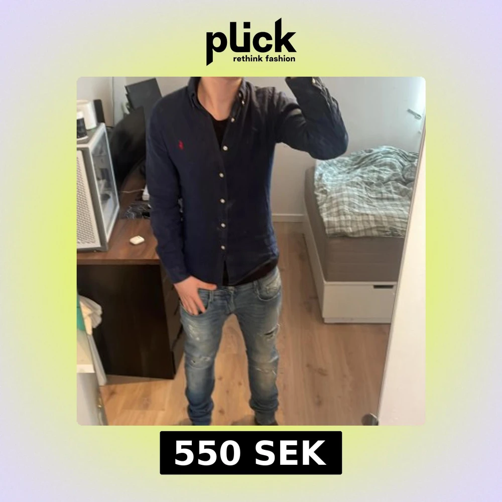 Säljer en mörkblå skjorta från Ralph Lauren med klassisk krage och knappar framtill. Skjortan har lång ärm och en liten röd broderad logga på bröstet. Perfekt för en stilren look.