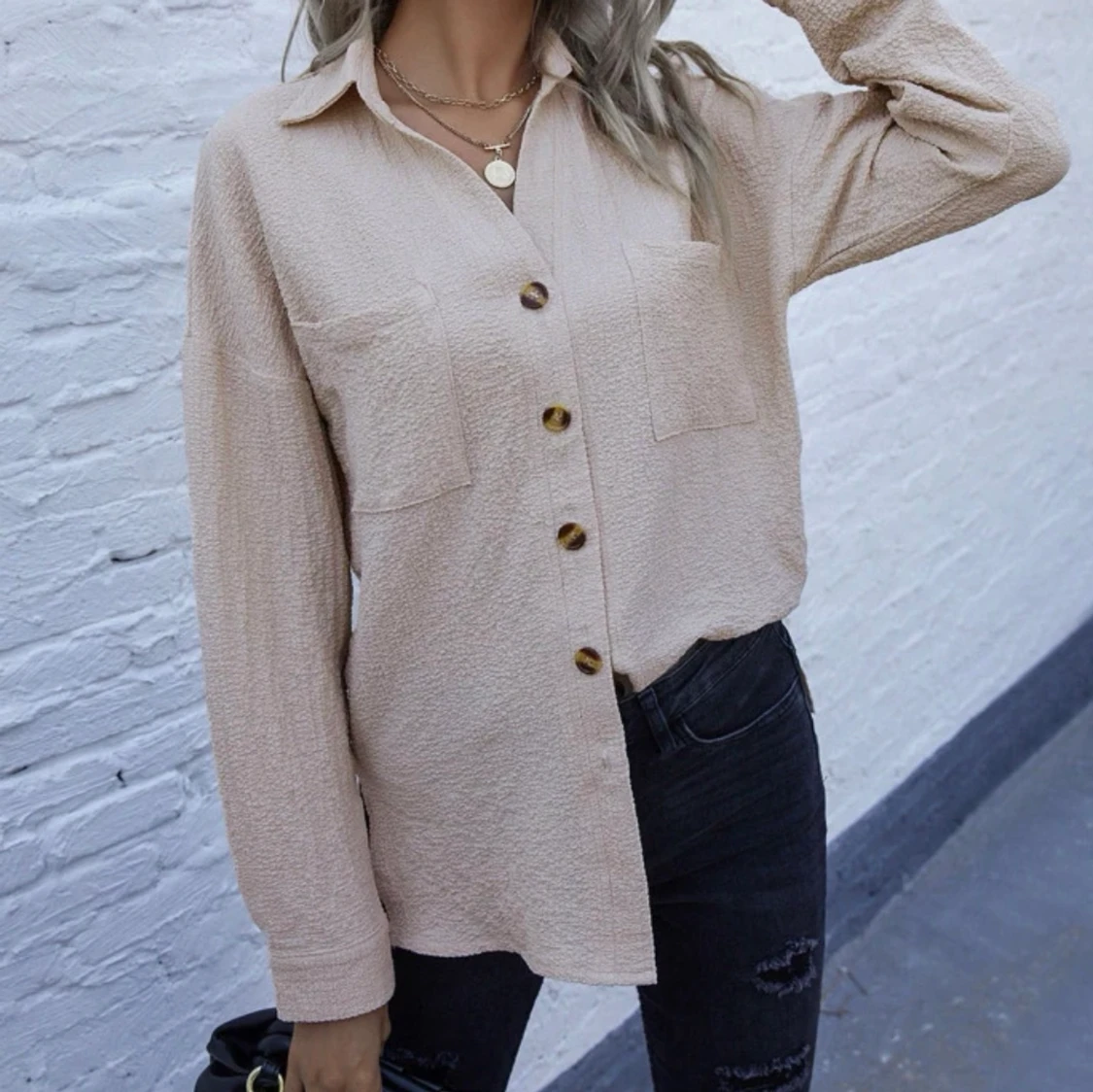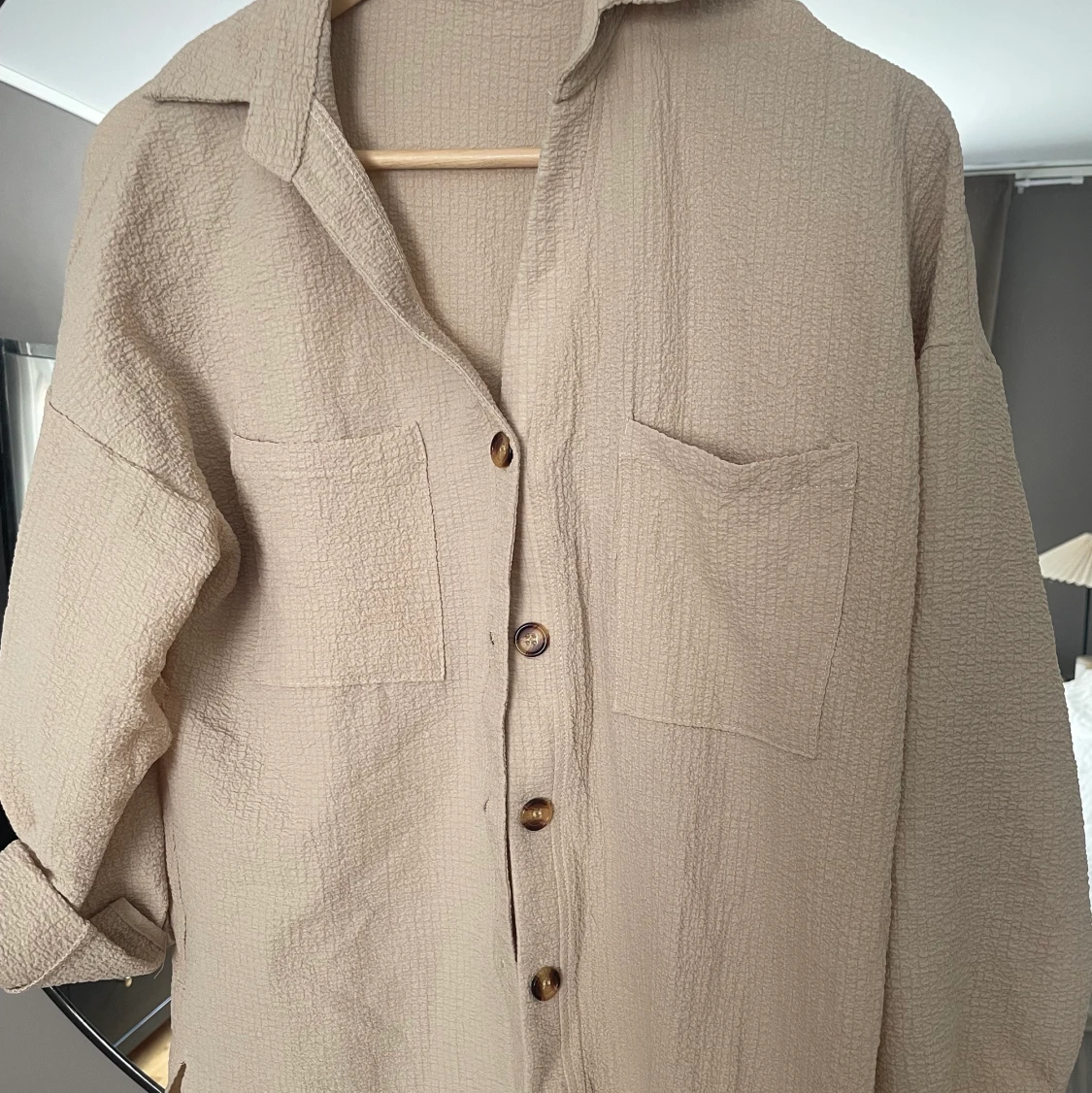 Beige skjorta från SHEIN, i ett ”skrynkligt” material, använd ca 1 gång🥰