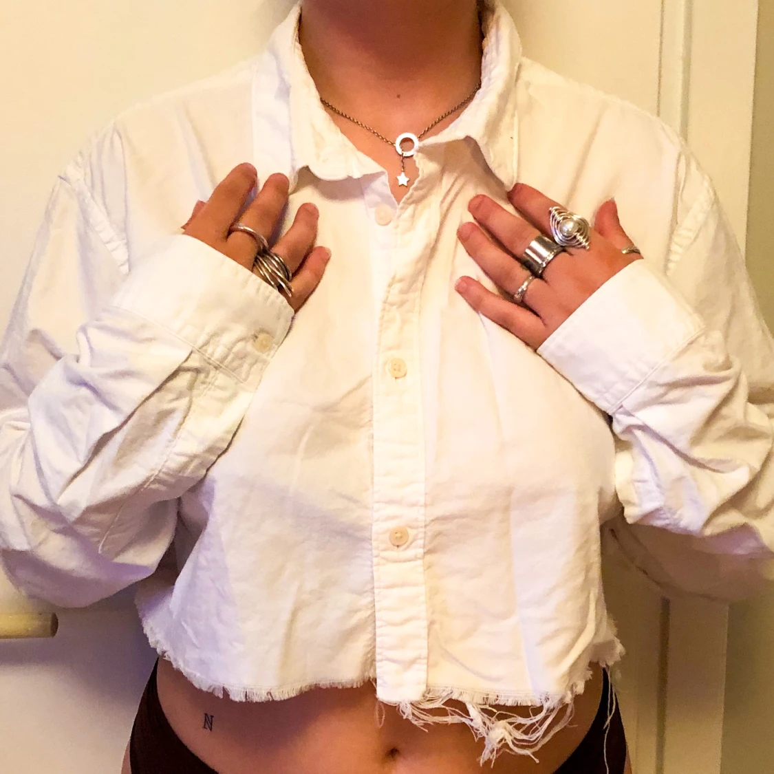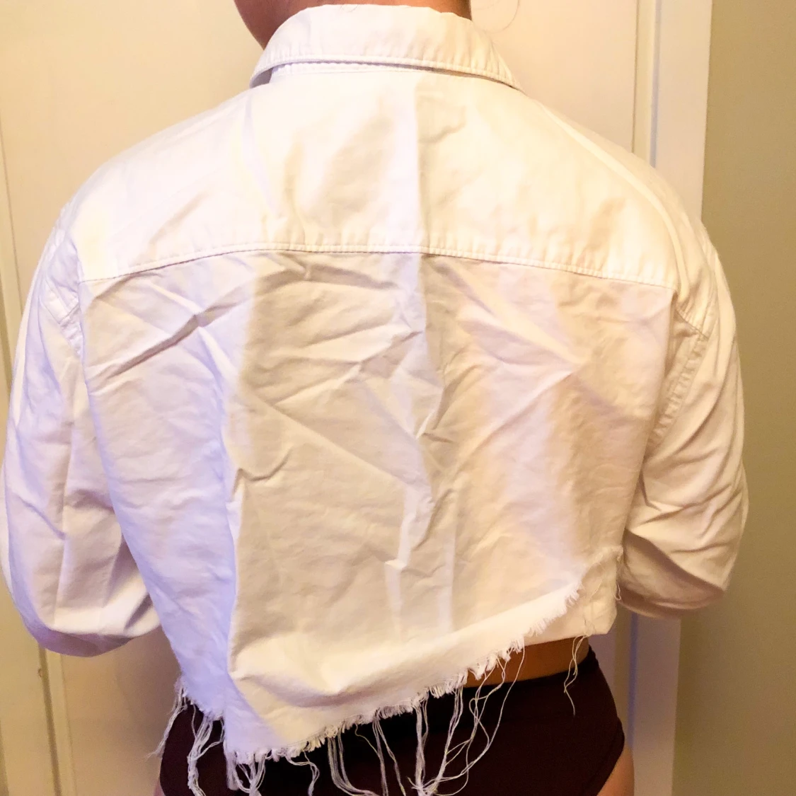 vit skjorta i avklippta design med trådar hängandes från nedre delen av tyget