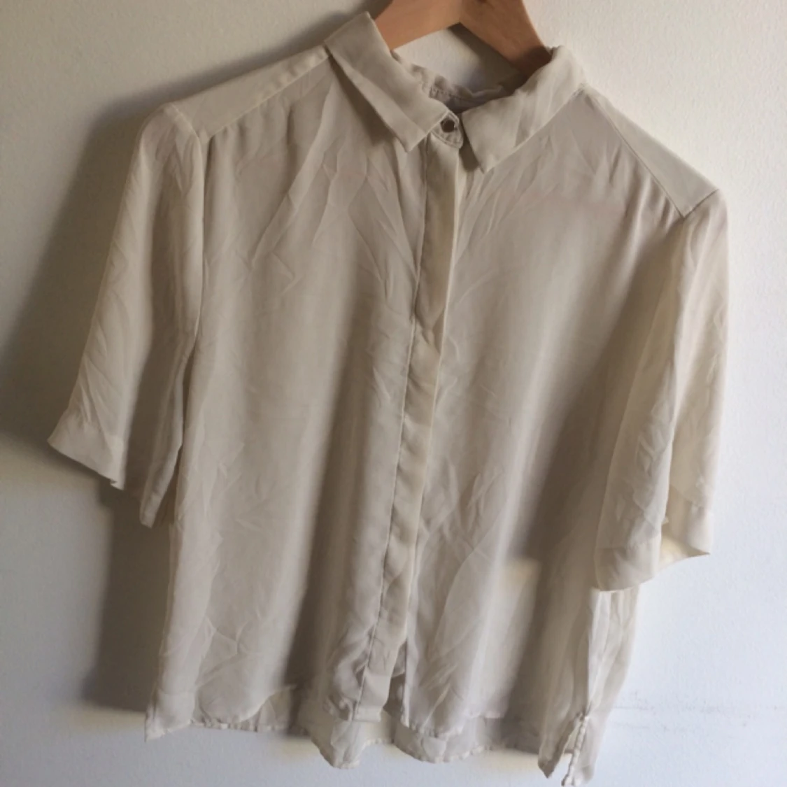 Vit kortärmad skjorta i kortare modell med silvrig övre knapp. Storlek 36 köpt på h&m. Snygg passform då den är lite loose. Gjord i polyester. Den silvriga knappen har tappat lite färg men inget som märks tydligt.