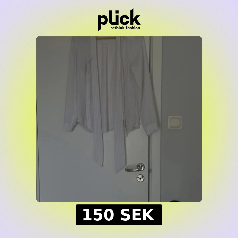 Säljer en vit blus från Stockh LM i storlek 40. Blusen har tunna grå ränder, långa ärmar och långa knytband framtill. Materialet känns lätt och luftigt, perfekt för en stilren look.