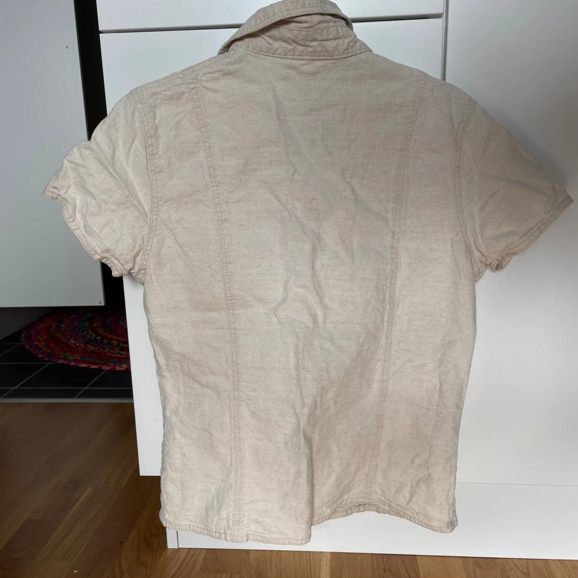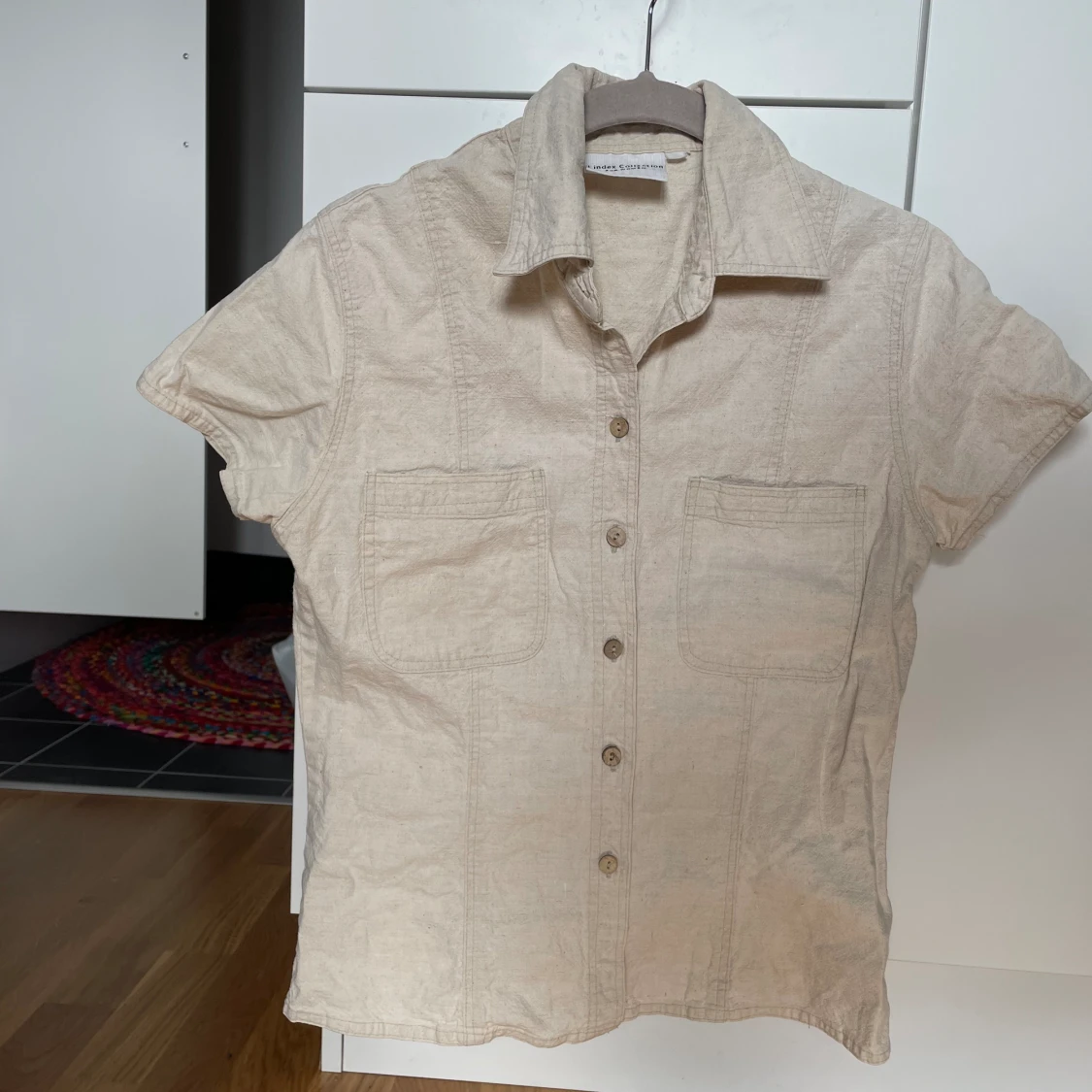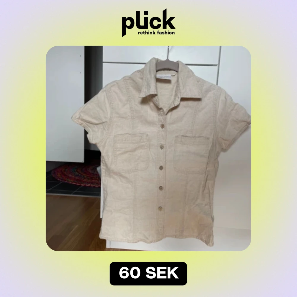 Söt skjorta som funkar att ha både öppen och stängd. Har knappar längst frma och materialet liknar linne.